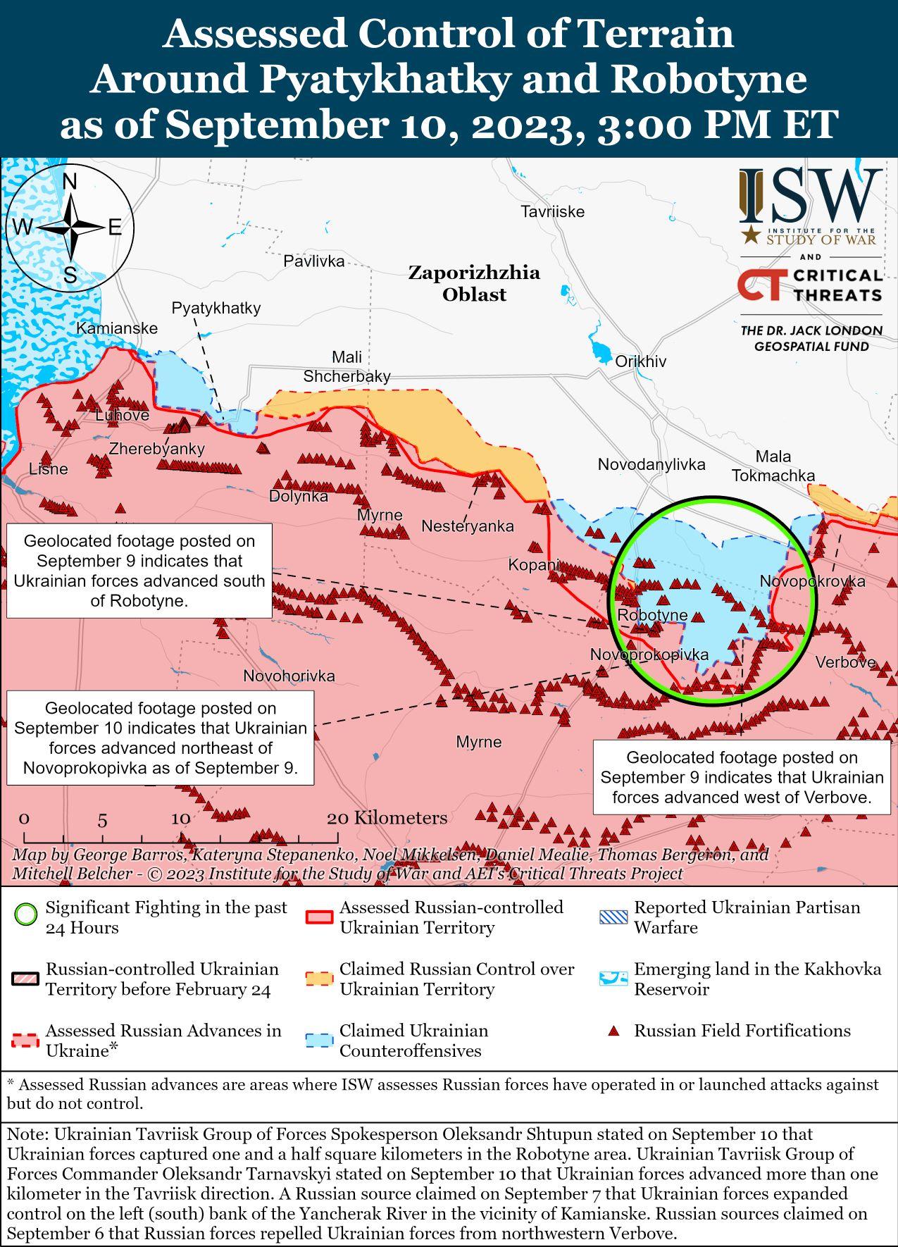 Украинские войска продолжили наступательные действия на западе Запорожской области и 10 сентября продвинулись вперед. На геолокационных кадрах, опубликованных 10 сентября, видно, что украинские силы добились успехов к востоку от Новопрокоповки (18 км к юго-востоку от Орехова). [52] Спикер Таврийской группировки войск Александр Штупун отметил, что украинские силы продолжают продвигаться в районе Роботино (12 км южнее Орехова) и освободили на этом направлении 1,5 кв. км территории. [53] Российские блогеры также сообщали, что украинские войска продолжают наступать на линии Роботино – Вербовое, в частности возле Новопрокоповки. [54] Один российский блогер отметил, что украинские военные также атаковали Копани (12 км к юго-западу от Орехова) с востока. [55] На участке фронта к западу от Роботино в последние недели заметно тише, и сообщения об активности Украины в этом районе могут свидетельствовать о возобновлении попыток наступления к юго-западу от Орехова.
