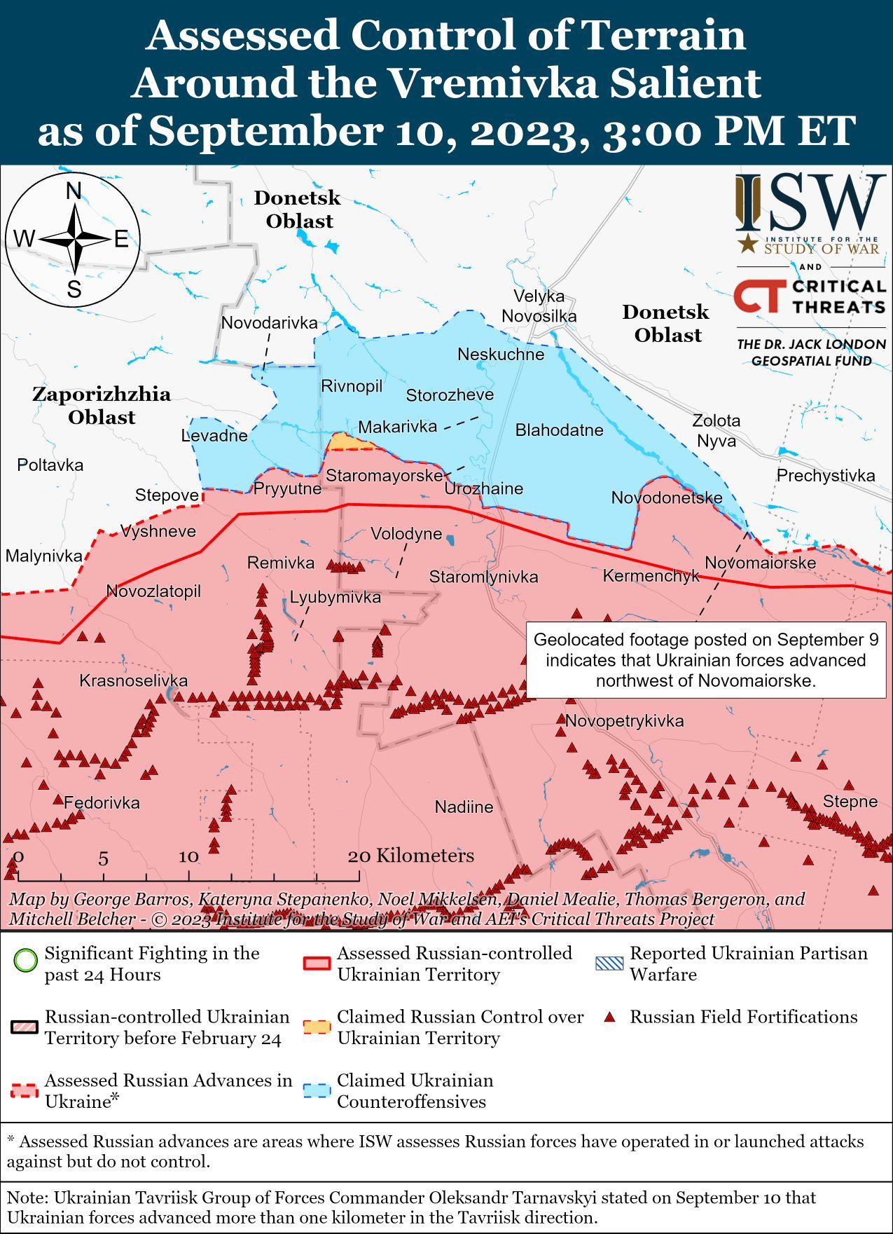 Российские источники утверждали, что украинские силы продолжали наступательные действия в районе границы Донецкой и Запорожской областей 10 сентября, но не продвинулись вперед. Российские блогеры в основном сообщали о том, что украинские войска продолжали наземные атаки на направлении Новодонецкое — Новомайорское (13–18 км к юго-востоку от Великой Новоселки). [47] Один из блогеров сообщил, что за ночь российские войска отразили три атаки украинской бронетехники на этом направлении. [48] Российские источники также утверждали, что позиционные бои продолжаются вблизи Урожайное и Старомайорское, примерно в 10 км к югу от Великой Новоселки. [49]