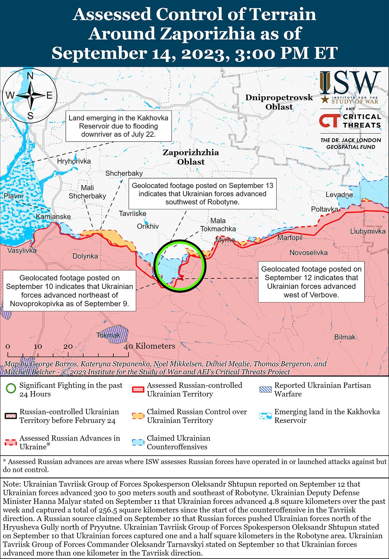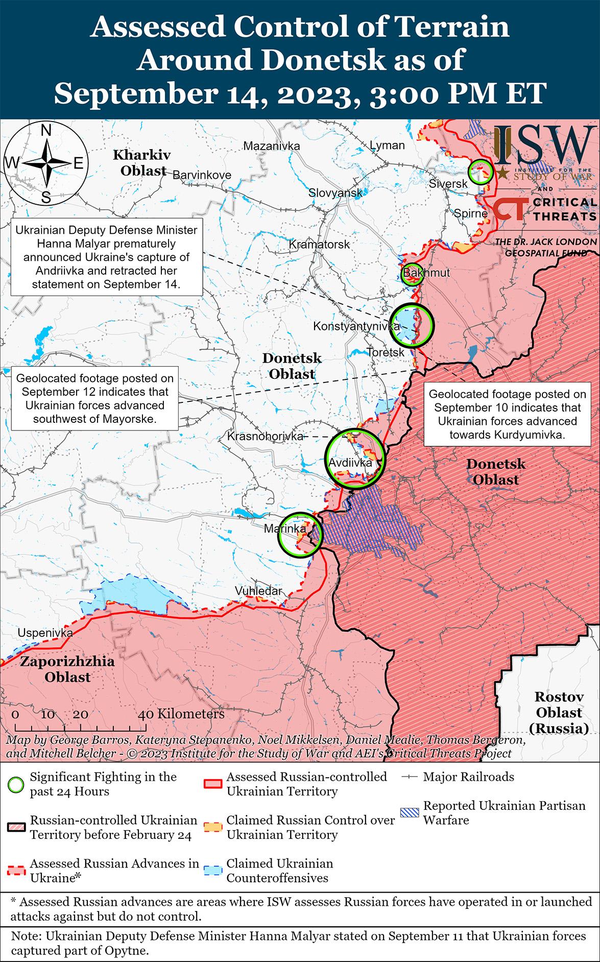 Украинские силы продолжали наступательные действия на западе Запорожской области и вокруг Бахмута и, как сообщается, 14 сентября продвинулись к югу от Бахмута. Генштаб Украины сообщил, что украинские силы добились неустановленных частичных успехов вблизи Бахмута, Клещеевки (7 км к юго-западу от Бахмута), Андреевки (10 км к юго-западу от Бахмута) и Курдюмовки (13 км к юго-западу от Бахмута). [1] Заместитель министра обороны Украины Анна Маляр преждевременно объявила об освобождении Украиной Андреевки, но позже уточнила, что тяжелые бои за населенный пункт все еще продолжаются. [2] 13 сентября спикер Восточной группы войск Украины Илья Евлаш заявил, что украинские силы вытеснили российские войска с позиций вблизи Миньковки (15 км к северо-западу от Бахмута) и Дубово-Васильевки (6 км к северо-западу от Бахмута). [3] Генштаб Украины и Маляр заявили, что украинские силы продолжают постепенно продвигаться на Мелитопольском направлении (запад Запорожской области). [4]