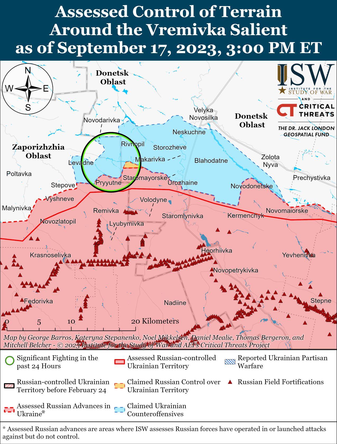 Российские источники утверждали, что украинские силы продолжали наступательные действия в районе Донецкой-Запорожской областей 17 сентября, но не продвинулись вперед. Российские источники, в том числе Министерство обороны России, утверждали, что украинские силы продолжали атаки вдоль линии Новодонецкое-Новомайорское (13-19 км к юго-востоку от Великой Новоселки), вблизи Старомайорского (10 км к югу от Великой Новоселки) и вблизи Приютного (15 км к юго-западу от Великой Новоселки). [44] Несколько российских источников сообщили, что боевые действия на этом участке в значительной степени приняли позиционный характер, и утверждали, что некоторые украинские подразделения проходят ротацию в этом районе. [45]