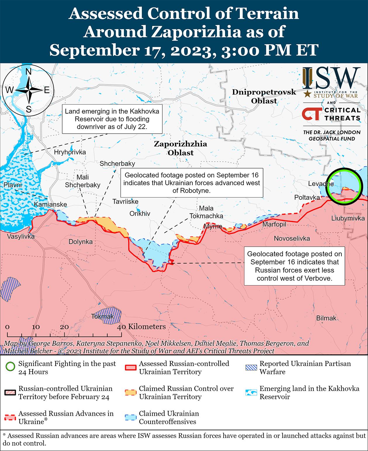 17 сентября украинские силы продолжили наступательные действия на западе Запорожской области и не добились каких-либо подтвержденных успехов. Украинские военные источники сообщили, что украинские силы продолжили наступательные действия на Мелитопольском направлении (запад Запорожской области) и добились успеха в неустановленных районах. [50] Минобороны России заявило, что российские войска отразили украинскую атаку возле Роботино (13 км к югу от Орехова). [51] Российские блогеры утверждали, что продолжаются тяжелые бои вдоль линии Роботино – Вербово, в частности в направлении Новопрокоповки (к югу от Роботино). [52] Один из российских источников утверждал, что украинские силы используют группы по два-три человека, чтобы попытаться продвинуться к югу от Роботино. [53]