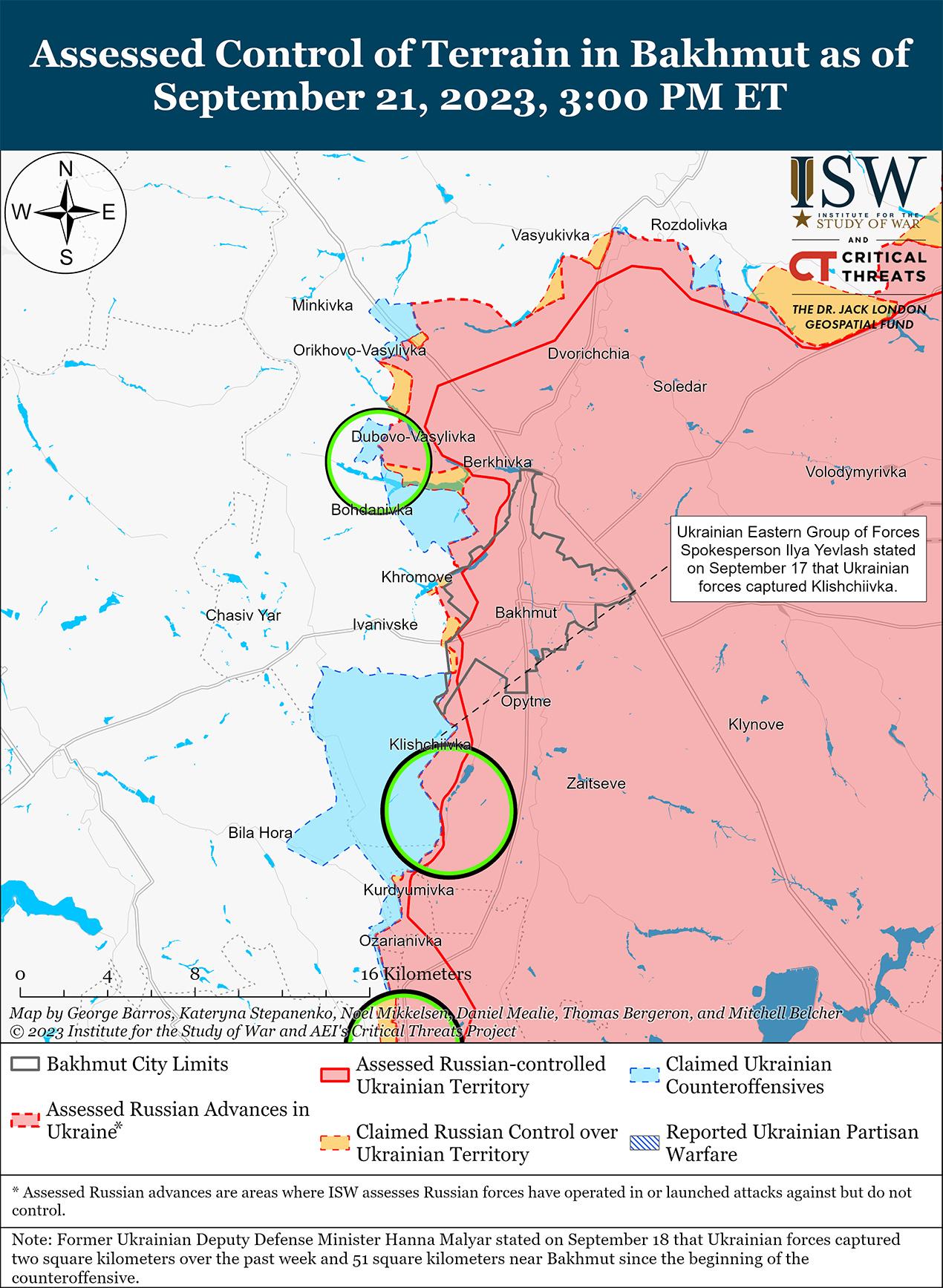 21 сентября украинские силы провели наступательные операции под Бахмутом и, как сообщается, продвинулись вперед. Спикер Восточной группировки войск Украины Илья Евлаш заявил 21 сентября, что украинские силы добились неопределенного успеха в районах населенных пунктов Одрадовка (9 км к югу от Бахмута), Андреевка (10 км к юго-западу от Бахмута) и Курдюмовка (12 км к юго-западу от Бахмута). [49] В Генштабе Украины сообщили, что украинские силы продолжают наступательные действия к югу от Бахмута. [50] Российские блогеры утверждали, что бои продолжаются вдоль линии Клещеевка – Озаряновка (7–14 км к юго-западу от Бахмута) и что столкновение произошло возле Берховки (6 км к северо-западу от Бахмута). [51] Евлаш заявил, что украинские позиции возле Андреевки и Клещеевки позволяют украинским силам подвести артиллерию ближе к трассе Т0513 (Бахмут-Горловка), что затрудняет использование российскими войсками этой НЛК. [52]