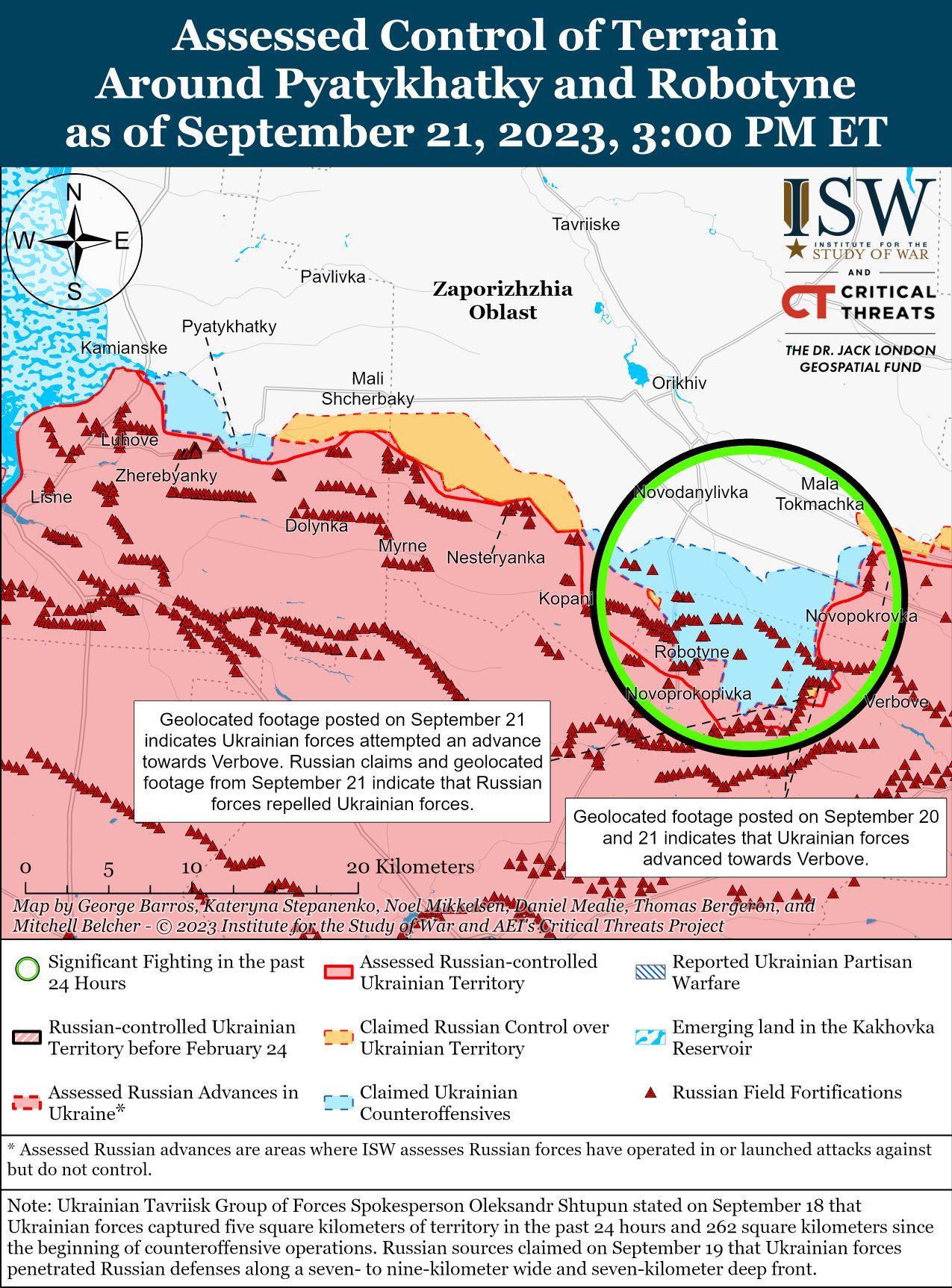 21 сентября украинские силы провели наступательные действия на западе Запорожской области и продвинулись вперед. Геолокационные кадры, опубликованные 20 сентября, показывают, что украинские силы продвинулись к юго-западу и западу от Вербового (18 км к юго-востоку от Орехова). [62] Украинский заместитель начальника отдела планирования применения главного управления Нацгвардии полковник Николай Уршалович заявил 21 сентября, что украинские силы добились неопределенных успехов, продвинулись в российскую оборону и продолжают вытеснять российские войска с их позиций на юге Украины, вероятно, на западе Запорожской области. [63] Российский источник утверждал, что украинские силы продвинулись на один километр между Новопокровкой (16 км к юго-востоку от Орехова) и Вербовым и контролировали трассу N08 (Пологи-Воскресенка). [64] Российские источники, в том числе Минобороны России, 20 и 21 сентября утверждали, что украинские силы безуспешно атаковали вблизи Роботино (10 км к югу от Орехова), Новопрокоповки (13 км к югу от Орехова) и Вербового. [65]
