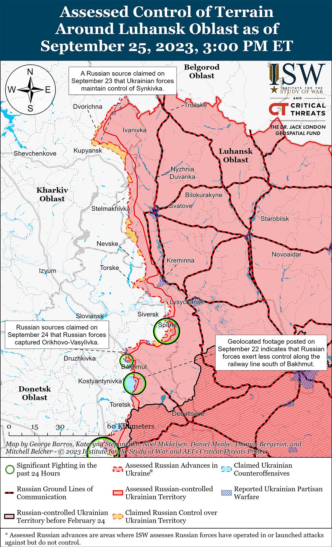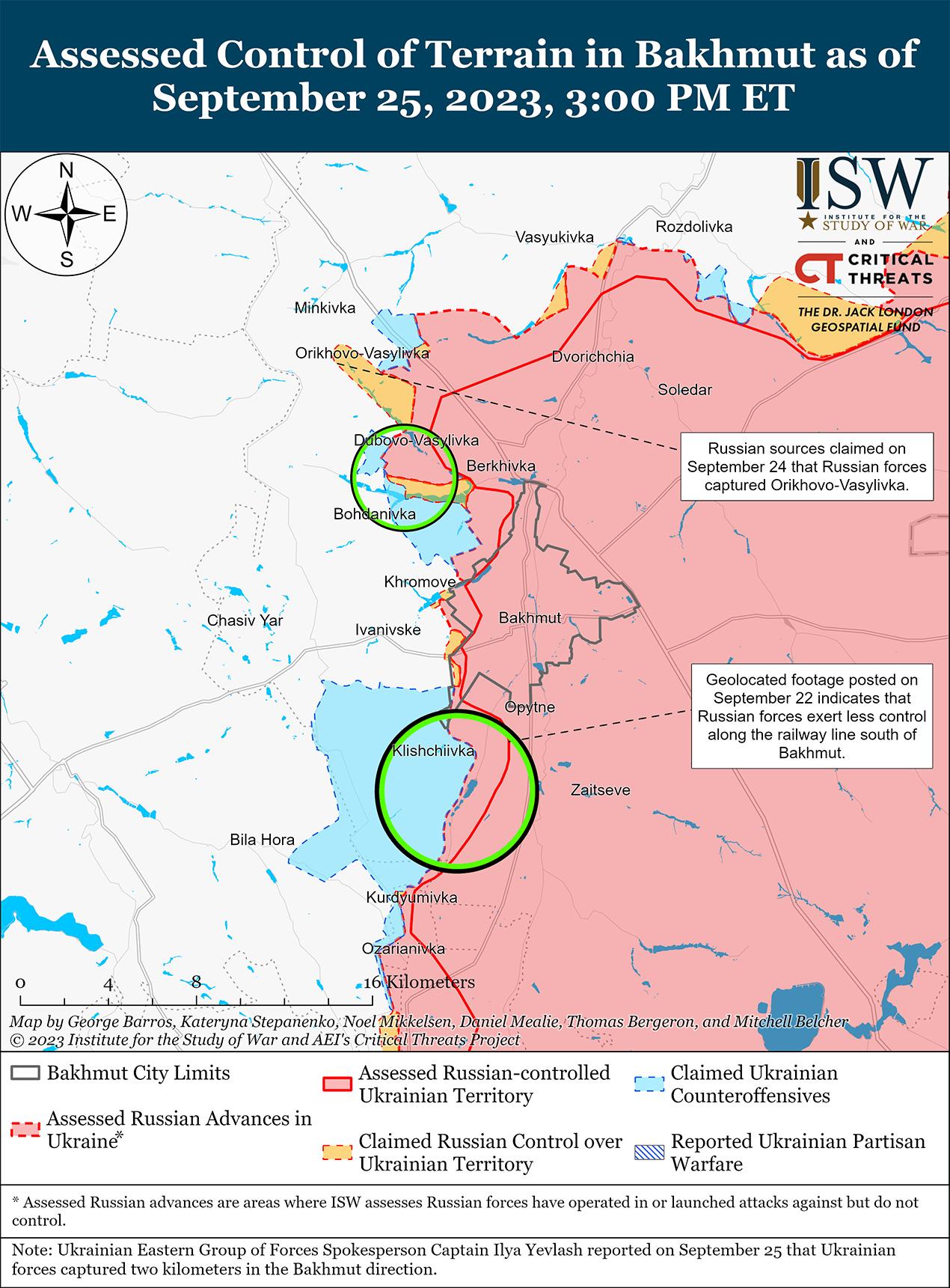 25 сентября украинские силы продолжили наступательные действия в районе Бахмута, но не добились каких-либо подтвержденных успехов. Спикер Восточной группировки войск Украины капитан Илья Евлаш заявил, что украинские силы освободили еще 2 км территории на Бахмутском направлении. [35] Минобороны России утверждало, что подразделения Южной группировки войск отражали украинские атаки вблизи Майорское (20 км к югу от Бахмута). [36] Российские военные блогеры утверждали, что украинские силы пытались прорвать российские оборонительные позиции вдоль железной дороги к востоку от Клещеевки (7 км к юго-западу от Бахмута). [37] Другой российский блогер утверждал, что украинские силы контратаковали возле Орехово-Васильевки (10 км к северо-западу от Бахмута) после того, как российские войска, как сообщается, захватили населенный пункт, хотя ISW до сих пор не видел визуального подтверждения того, что российские войска захватили Орехово-Васильевку. [38] Российский блогер отметил, что линия фронта под Бахмутом в последнее время не изменилась. [39]