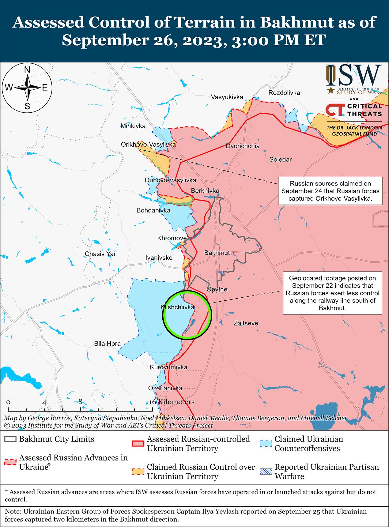 26 сентября украинские силы продолжили наступательные действия в районе Бахмута и, по сообщениям, продвинулись вперед. В Генштабе Украины сообщили, что украинские силы продолжают наступательные действия на Бахмутском направлении, а спикер Восточной группировки войск Украины капитан Илья Евлаш заявил, что украинские силы добились успехов в районах населенных пунктов Ивановское (6 км к западу от Бахмута), Клещеевка (7 км к юго-западу от Бахмута), Одрадовка (7 км к югу от Бахмута) и Зайцево (20 км к югу от Бахмута). [46] Российские блогеры утверждали, что украинские войска продолжали штурмовать Клещеевку и что российские войска отошли с позиций вдоль участка железнодорожной ветки к северо-востоку от Клещеевки. [47] Известный российский блогер заявил, что небольшие украинские штурмовые группы продолжают периодические атаки вдоль всей линии Клещеевка – Андреевка – Курдюмовка (до 13 км к юго-западу от Бахмута). [48]