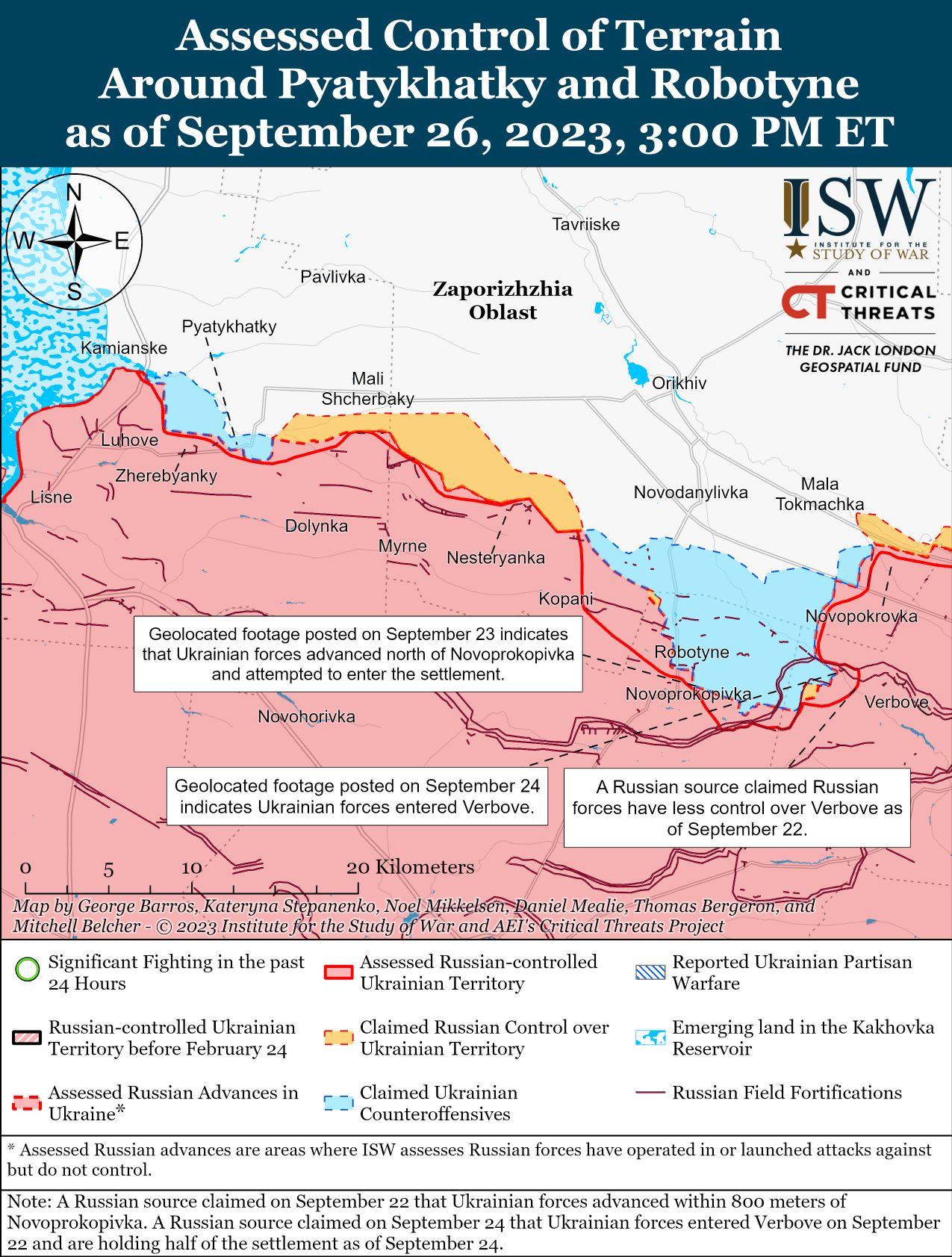 - Тактическая ситуация в Вербовом остается неясной, поскольку украинские силы продолжали наступательные действия на западе Запорожской области 26 сентября.