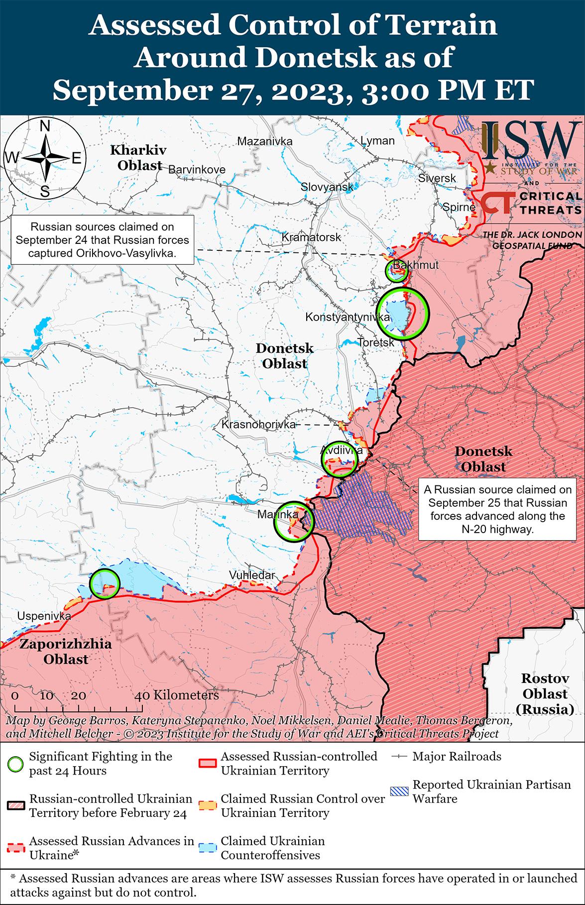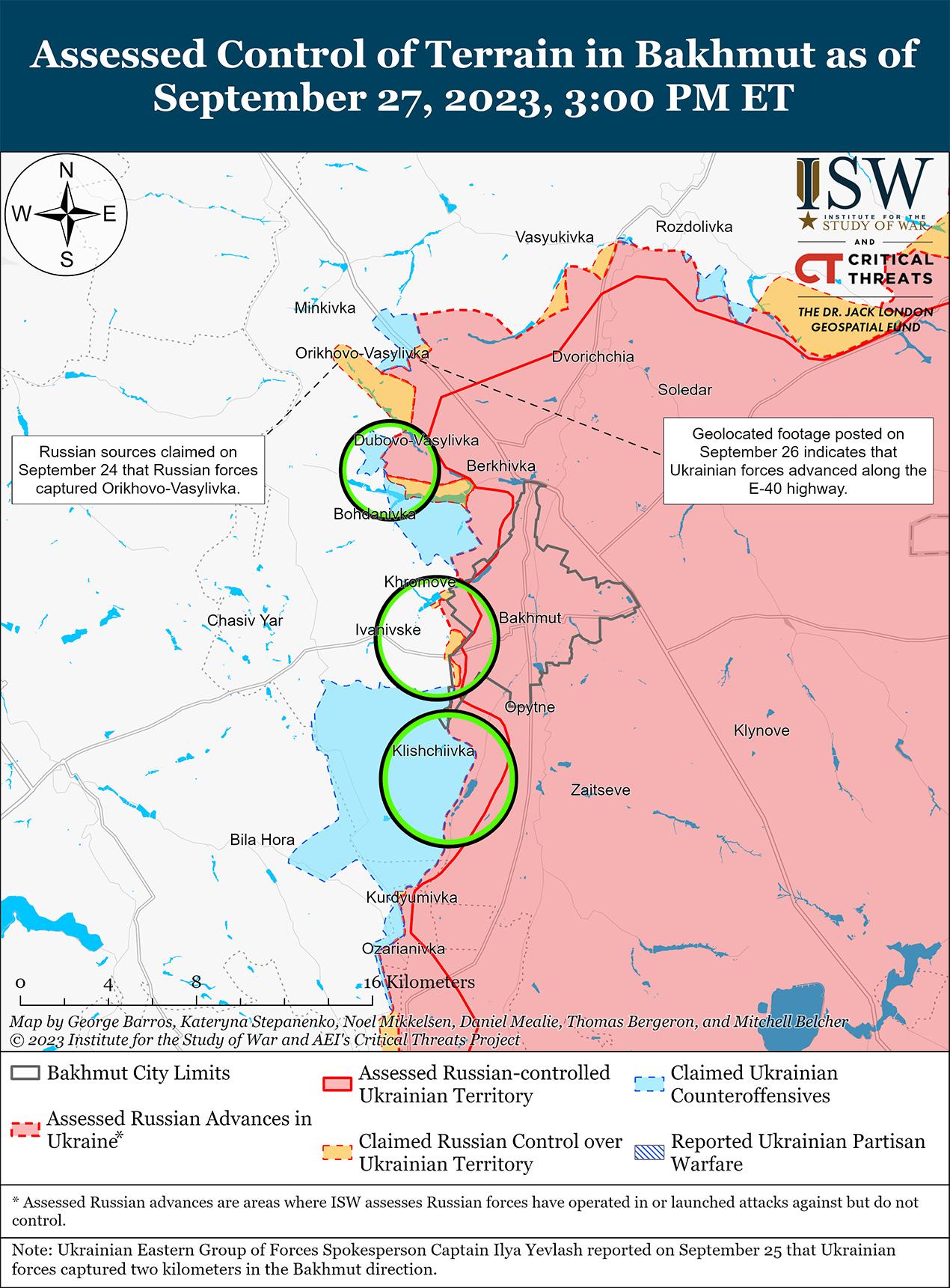 27 сентября украинские войска продолжили наступательные действия в районе Бахмута и продвинулись вперед. Геолокационные кадры, опубликованные 26 сентября, показывают, что украинские силы незначительно продвинулись к востоку от Орехово-Васильевки (10 км к северо-западу от Бахмута). [23] 27 сентября спикер Восточной группировки войск Украины капитан Илья Евлаш заявил, что украинские силы успешно действуют в направлениях Клещеевка (7 км к юго-западу от Бахмута), Одрадовка (7 км к югу от Бахмута) и Шумы (22 км к юго-западу от Бахмута). [24] 26 сентября Пограничная служба Украины заявила, что украинские силы продолжают продвигаться на Бахмутском направлении и обороняют недавно отбитые позиции. [25] 27 сентября российские источники утверждали, что украинские силы продолжают попытки прорвать российскую оборону вблизи Клещеевки, Андреевки (10 км к юго-западу от Бахмута) и Курдюмовки (12 км к юго-западу от Бахмута). [26] Другой российский блогер сообщил, что российские войска отразили атаку украинской бронетехники между Железнянским (13 км к северу от Бахмута) и Орехово-Васильевкой. [27] Российский новостной агрегатор утверждал, что 6 сентября российские войска отразили украинскую атаку в районе Берховка (26 км к северо-западу от Бахмута). [28] Связанный с Кремлем военный блогер заявил, что украинские силы сосредотачивают живую силу под Бахмутом, возможно, для попытки прорыва в этом районе. [29]