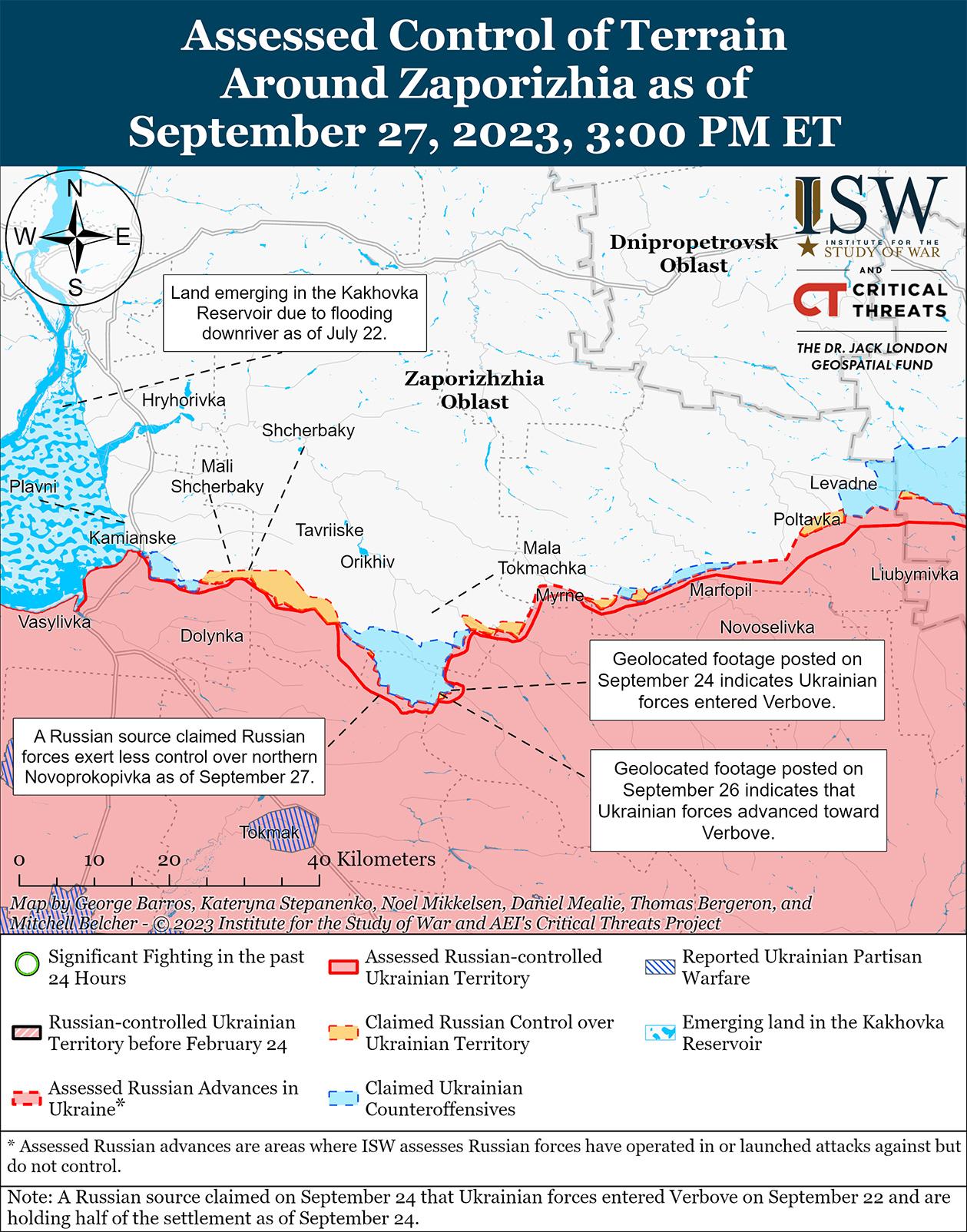 27 сентября украинские войска продолжили контрнаступательные действия на западе Запорожской области и вышли на линию траншей к западу от Вербового (16 км к юго-востоку от Орехова). На геолокационных кадрах, опубликованных 26 сентября, видно, как российский беспилотник наносит удар по украинской пехоте в траншее к западу от Вербовое, а использование Россией беспилотников для поражения этих украинских сил указывает на то, что российские войска, вероятно, больше не присутствуют на линии траншей длиной примерно один километр к западу от Вербовое. [42] Оккупационный чиновник Запорожской области Владимир Рогов заявил 26 сентября, что по меньшей мере четыре украинские роты со значительным количеством техники штурмовали российские позиции вдоль линий Роботино — Вербовое после того, как сначала провели массированный артиллерийский обстрел. [43] Российский блогер, который горячо поддерживает командующего Воздушно-десантными войсками (ВДВ) России генерал-полковника Михаила Теплинского, критикуя Министерство обороны (МО) России, ответил Рогову, заявив, что украинские силы уже прошли минные поля и противотанковые заграждения «зубы дракона» на линии Роботино-Вербовое и что украинские силы рано или поздно провели бы такие атаки. [44] Командующий Таврийской группировкой войск бригадный генерал Александр Тарнавский заявил, что на Запорожском направлении «будут хорошие новости», и отметил, что украинские силы неуклонно продвигаются, но не предоставил дополнительной информации. [45]