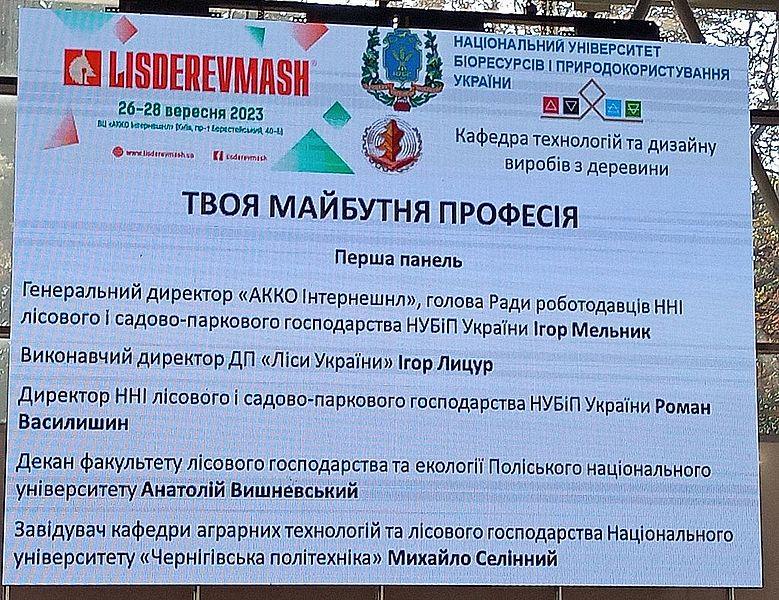 27 вересня, у другий день роботи виставки вітчизняних і світових технологій для деревообробної та лісової галузі LISDEREVMASH 2023 був молодіжно насиченим, бо саме майбутні майбутні лісівники брали участь в обговореннях та дискусіях тематичного дня «Твоя майбутня професія». У дискусійній панелі «Твоя майбутня професія» долучилися студент з трьох вузів України – Навчально- наукового інституту лісового і садово-паркового господарства НУБіП України (м. Київ), факультету лісового господарства та екології Поліського національного університету (м. Житомир); кафедри аграрних технологій та лісового господарства «Чернігівська подітехніка» (м. Чернігів).