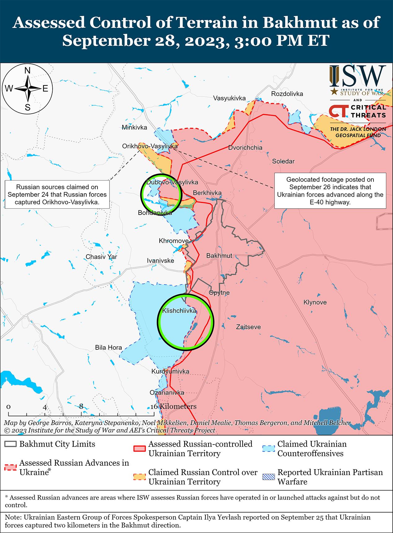 28 сентября российские войска провели наступательные действия в районе Бахмута, но не добились подтвержденных успехов. 27 сентября российский блогер заявил, что российские войска очистили от украинских сил Орехово-Васильевку (10 км к северо-западу от Бахмута), но ISW не обнаружил доказательств этого повторяющегося российского заявления. [51] 28 сентября Генштаб Украины сообщил, что российские войска провели безуспешные атаки в районе населенных пунктов Григоровка (9 км к северо-западу от Бахмута), Клещеевки и Андреевки. [52] Украинский директор планового управления Главного управления Нацгвардии полковник Николай Уршалович заявил, что российские военные усиливают передовые подразделения, чтобы не допустить дальнейшего продвижения Украины на Бахмутском направлении. [53]
