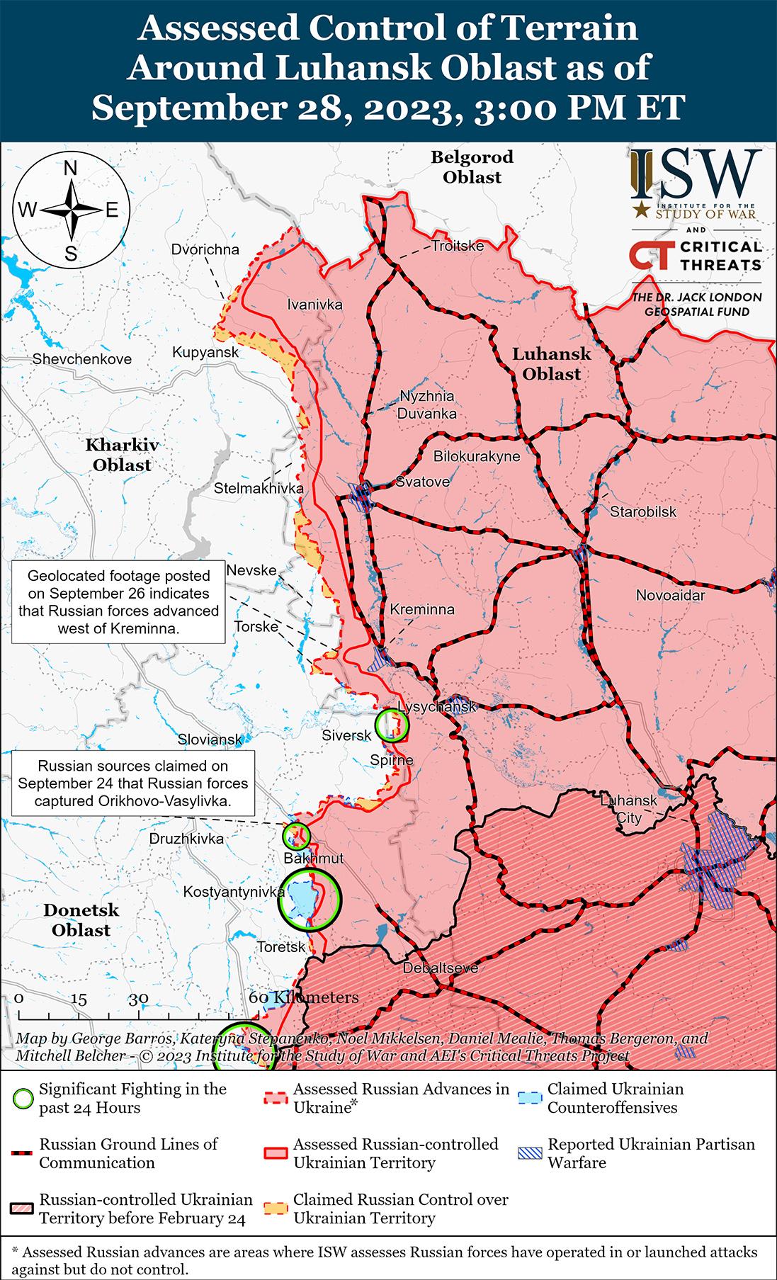 28 сентября российские войска продолжили ограниченные наземные атаки на рубеже Купянск — Сватово — Кременная, но не продвинулись вперед. Генеральный штаб Украины сообщил, что украинские силы отразили наземную атаку России в районе Белогоровки Луганской области (13 км к югу от Кременная). [37] 27 сентября российский блогер заявил, что российские войска продолжают оказывать давление на украинские силы вблизи Синьковки (6 км к северо-востоку от Купянска), Петропавловки (7 км к востоку от Купянска) и Кисловки (20 км к юго-востоку от Купянска), а также к западу от Сватово. [38] 27 и 28 сентября другие российские источники утверждали, что в районе Серебрянского лесничества (11 км к югу от Кременной) продолжаются ограниченные боевые действия. [39]