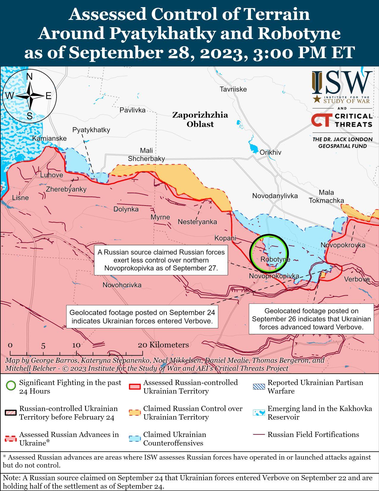 28 сентября российские войска продолжили контратаки на западе Запорожской области, но не добились никаких подтвержденных успехов. В украинском Генштабе сообщили, что российские войска предпринимали безуспешные попытки восстановить утраченные позиции возле Червоного (9 км восточнее Гуляйполя) и возле Роботино. [70] Российский блогер распространил кадры, на которых якобы видно, как подразделения 247-го гвардейского десантно-штурмового полка (ВДВ) (7-я гвардейская дивизия ВДВ) контратакуют под Вербовым, и утверждал, что эти элементы захватили позиции в близлежащих опорных пунктах, хотя ISW не наблюдал геолокационных доказательств каких-либо недавних российских достижений в этом районе. [71]
