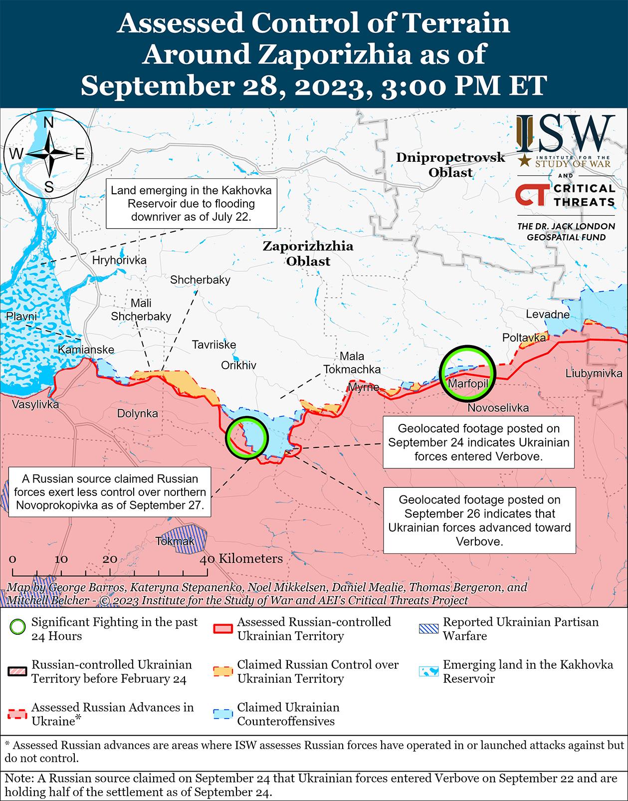 28 сентября украинские войска продолжили наступательные действия вблизи Бахмута и на западе Запорожской области. В украинском Генштабе сообщили, что украинские силы продолжают наступательные действия на Мелитопольском (запад Запорожской области) направлении и на Бахмутском направлении. [1] Добровольческие батальоны «Буря Осетия» и «Алания» утверждали, что неуказанные источники продолжают распространять ложную информацию об украинском прорыве в районе Роботино-Вербовое, возможно, ссылаясь на заявления маргинального российского блогера от 22 и 23 сентября о том, что украинские силы продвинулись в Вербовое (18 км к юго-востоку от Орехова). [2] ISW не смог подтвердить это сообщение и не будет продолжать регистрировать его в отсутствие визуального подтверждения или аналогичных заявлений из других российских источников.