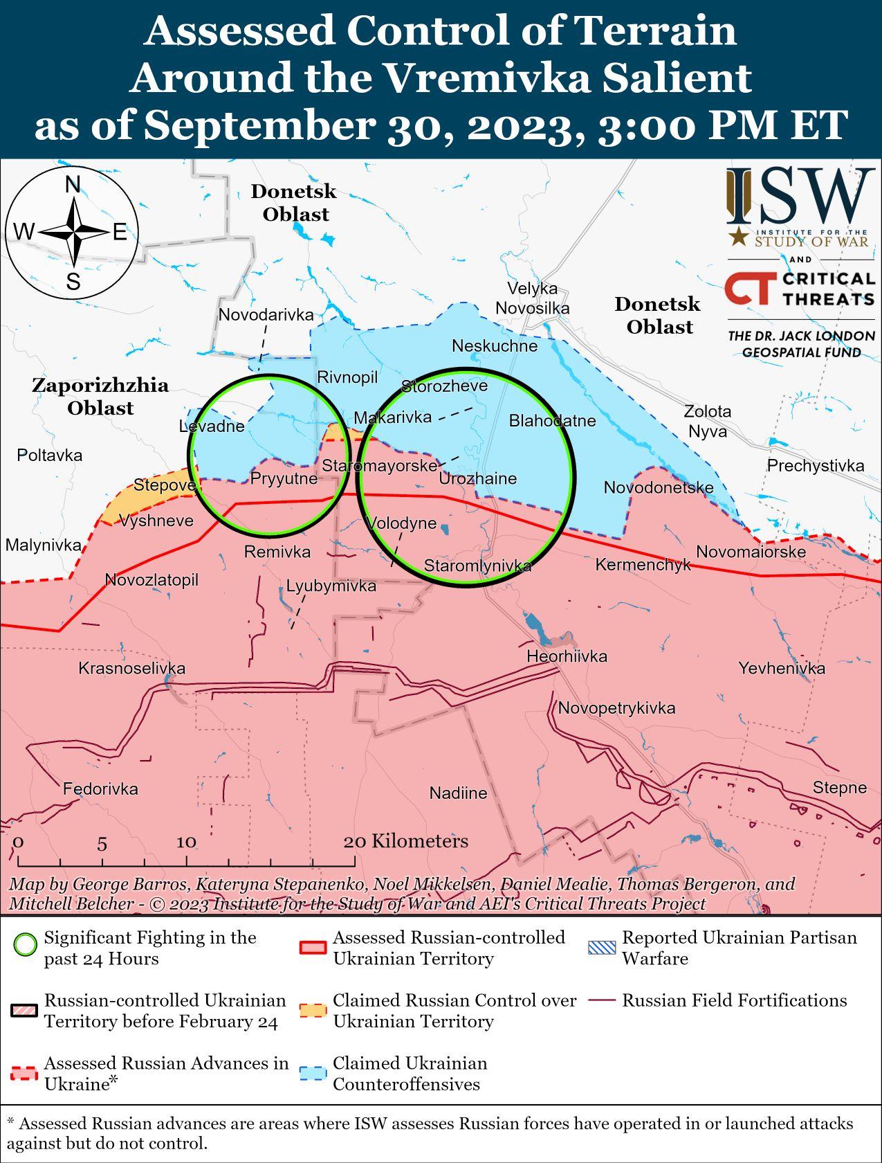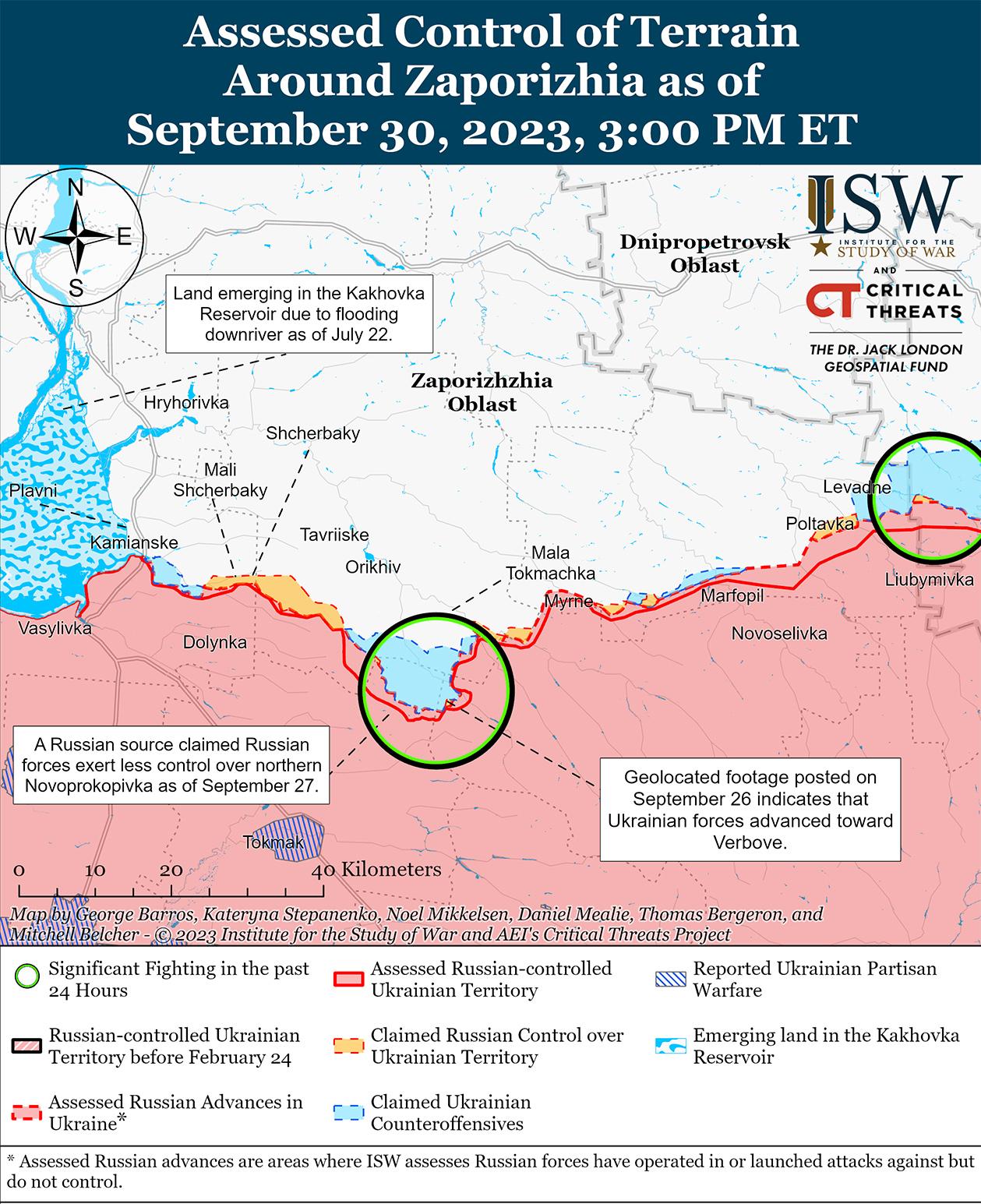 30 сентября российские войска продолжили контратаки на западе Запорожской области и недавно добились незначительных успехов. Геолокационные кадры, опубликованные 29 сентября, показывают, что российские войска отбили ограниченные позиции на ряде ранее потерянных российских оборонительных позиций к югу от Роботино. [53] Генеральный штаб Украины сообщил, что 30 сентября российские войска безуспешно пытались отбить утраченные позиции возле Роботино и Вербового. [54] Российский блогер заявил, что российские войска также контратакуют возле Новоданиловки (4 км к югу от Орехова) и Малой Токмачки (7 км к юго-западу от Орехова). [55] Милблогер утверждал, что российские войска возобновили действия к юго-востоку от Гуляйполя, вероятно, имея в виду ограниченные наступательные действия России вблизи Червоного (9 км к востоку от Гуляйполя). [56] Российские источники признали, что российская ПВО сбила российский истребитель Су-35 в результате поражения собственного самолета в районе Токмака 29 сентября, о чем ранее сообщал ISW. [57]