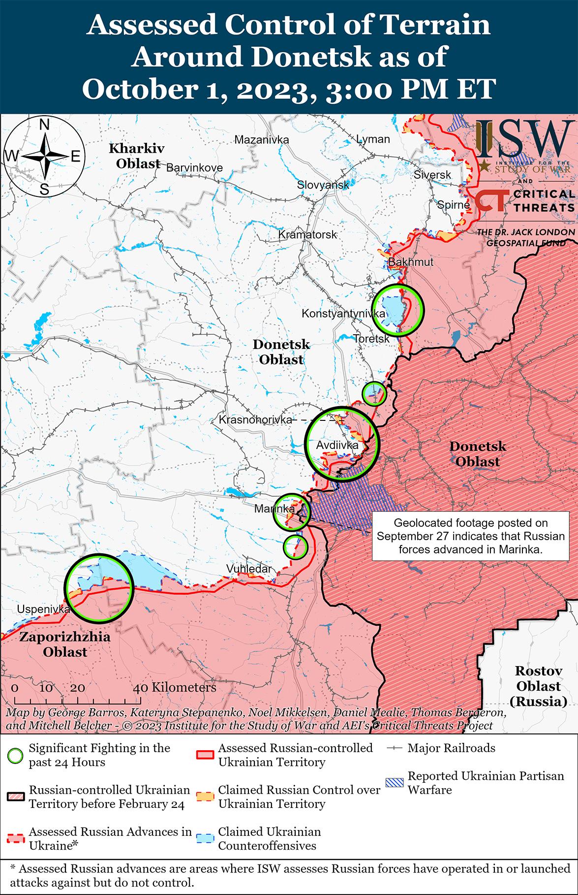 1 октября российские войска продолжали наземные атаки вдоль линии Авдеевка-Донецк, но не добились каких-либо подтвержденных успехов. Генштаб Украины сообщил, что российские войска провели безуспешные атаки вблизи Новоселовки (15 км к северо-востоку от Авдеевки), Степового (8 км к северо-западу от Авдеевки), Авдеевки, Веселого (на северо-западной окраине Донецка), Марьинки (к юго-западу от Донецка) и Новомихайловки (10 км к юго-западу от Донецка). [44] Российский блогер заявил, что российские войска также безуспешно обстреливали районы Северного (6 км к западу от Авдеевки) и Опытное (3 км к юго-западу от Авдеевки). [45] Российский новостной агрегатор утверждал, что 30 сентября российские войска нанесли удар к югу от Авдеевки. [46] 1 октября другой российский блогер распространил кадры, на которых видно, как на Авдеевском направлении действуют подразделения 9-го армейского корпуса 1-й мотострелковой бригады (ДНР). [47] 30 сентября еще один российский блогер опубликовал кадры, на которых запечатлены подразделения российского 1453-го полка (1-я Славянская бригада, 1-й армейский корпус ДНР), действовавшего под Авдеевкой. [48]