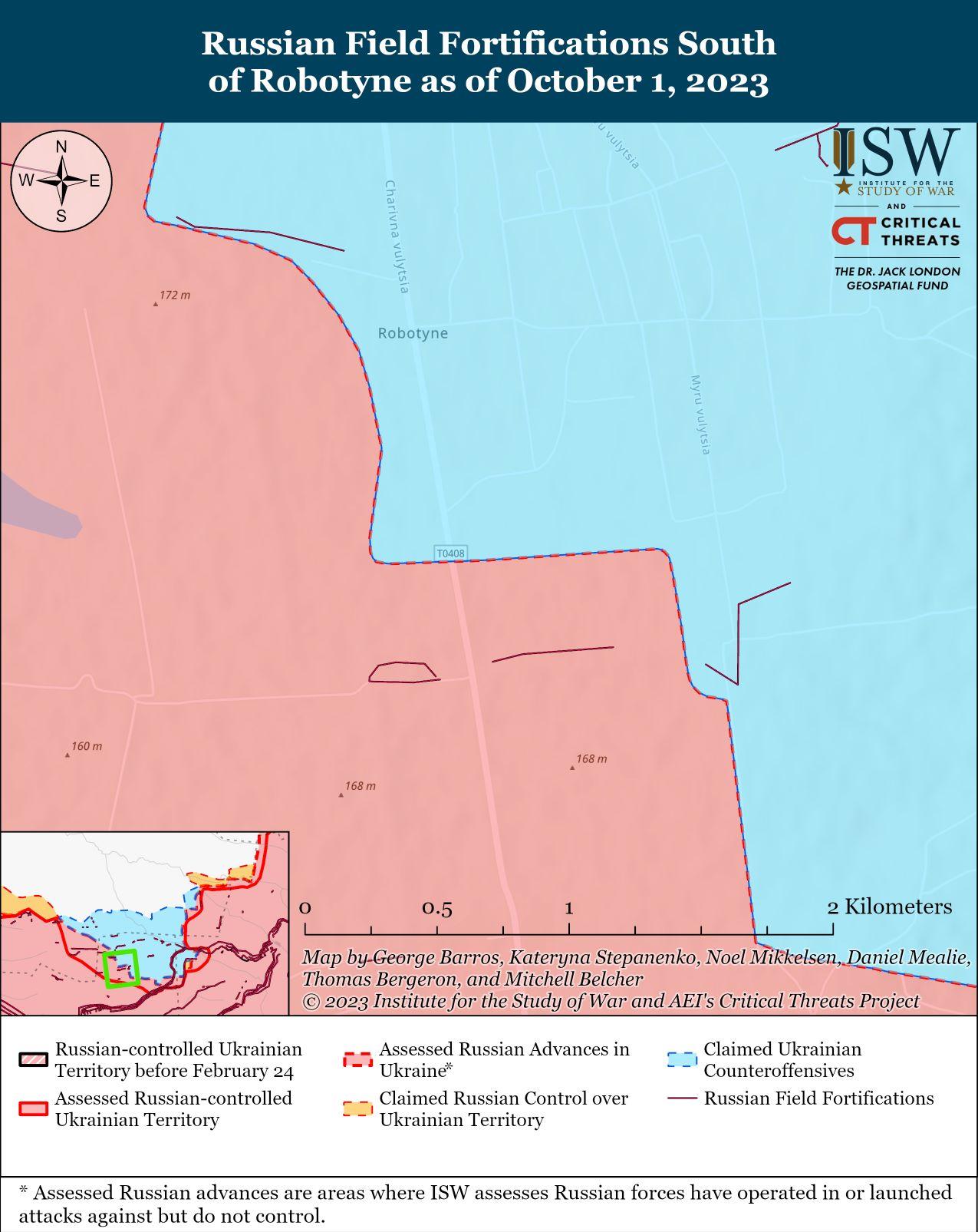 Российские войска проводят тактические контратаки в районе Роботино в рамках своей мобильной обороны против продолжающихся наступательных операций Украины на западе Запорожской области. Ситуация к югу от Роботино нестабильна, поскольку некоторые тактически значимые полевые укрепления несколько раз переходили из рук в руки. На геолокационных кадрах, опубликованных 30 сентября, видно, как украинские войска наносят удары по российским войскам, пытающимся проникнуть в систему траншей примерно в 1 км к юго-западу от Роботино, недалеко от дороги Т0408 Роботино — Токмак. [1] На кадрах, опубликованных 13 сентября, видно, что украинские силы ранее занимали участки этой траншеи и, таким образом, по-видимому, потеряли ее в результате российских контратак в период с 13 по 30 сентября. [2] ISW перекодировал этот участок с контрнаступления Украины на наступление России.