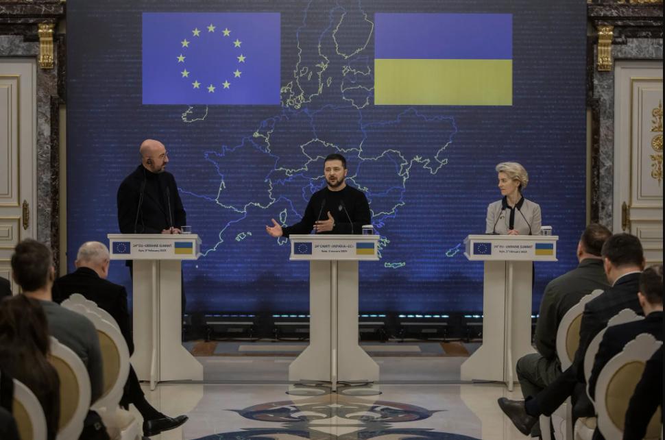 Президент Украины Владимир Зеленский (в центре), председатель Европейского совета Шарль Мишель (слева) и председатель Европейской комиссии Урсула фон дер Ляйен во время саммита в феврале. Фото…Эмиль Даке для «Нью-Йорк Таймс»