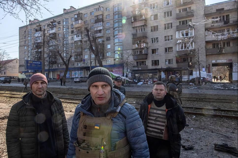 Мэр Киева Виталий Кличко (в центре) и его брат Владимир Кличко (слева) посещают жилой район после обстрела в 2022 году. Фото: Роман Пилипей/EPA, через Shutterstock