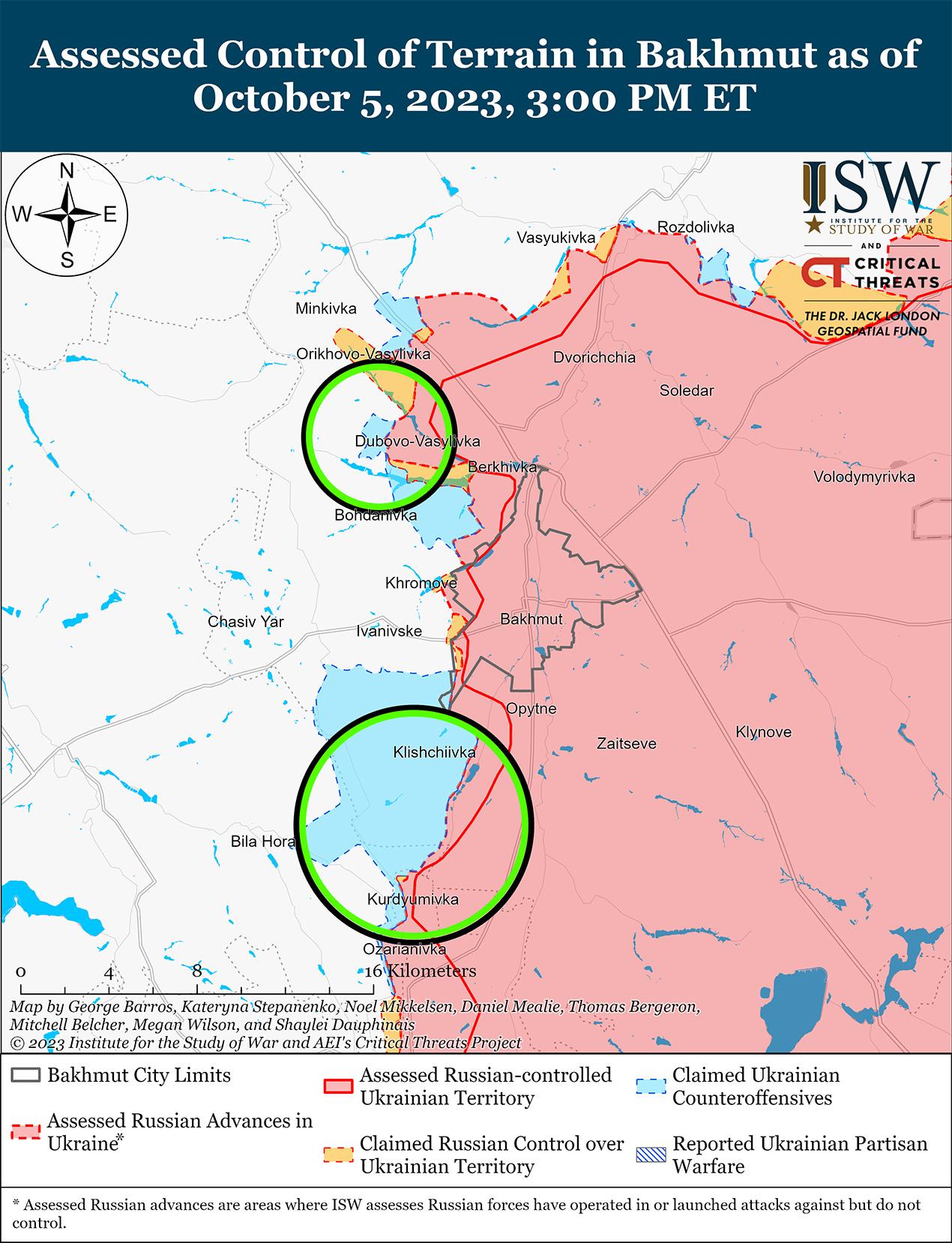 Российские войска вели наступательные действия вблизи Бахмута, но 5 октября не продвинулись вперед. Генштаб Вооруженных сил Украины сообщил, что российские войска безуспешно пытались отбить утраченные позиции к востоку от Дилиевка (15 км к юго-западу от Бахмута) и в районах населенных пунктов Григорьевка (9 км к северо-западу от Бахмута), Клещеевка и Андреевка. [40] 4 и 5 октября российские источники утверждали, что российские войска по-прежнему удерживают недавно захваченные позиции в районе Орехово-Васильевка (11 км к северо-западу от Бахмута). [41]