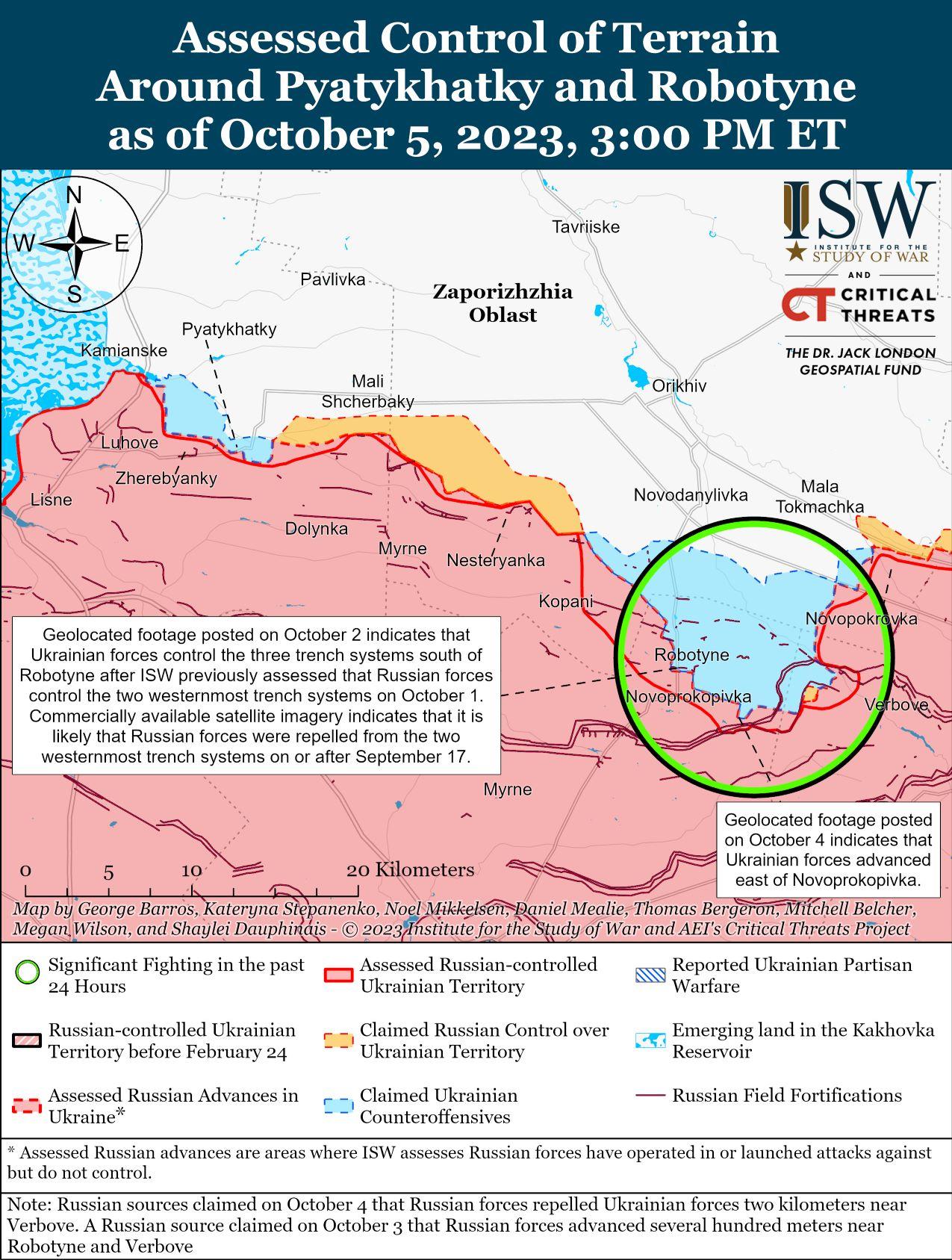 5 октября украинские силы провели наступательные действия на западе Запорожской области и, как сообщается, продвинулись вперед. Пресс-секретарь украинской Таврической группировки войск полковник Александр Штупун сообщил, что украинские силы добились частичного успеха к западу от Роботино (10 км к югу от Орехова). [51] Генштаб ВСУ сообщил, что украинские силы продолжают вести наступательные действия на Мелитопольском направлении (западная часть Запорожской области). [52] Российские военные блогеры утверждали, что украинские военные пытались наступать вдоль линии Роботино – Вербовое (10 км к югу – 18 км к юго-востоку от Орехова), на Копаньском направлении (11 км к юго-западу от Орехова) и в районе Новопрокоповки (16 км южнее Орехова). [53] 4 октября российский военный блогер заявил, что украинские войска добились ограниченного продвижения вдоль линии Копани — Роботино — Вербовое. [54]