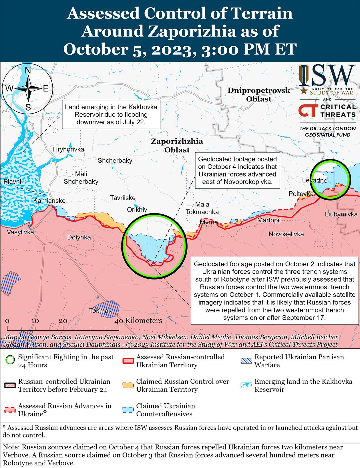 - Украинские силы продолжили наступательные действия вблизи Бахмута и на западе Запорожской области и, как сообщается, продвинулись 5 октября.