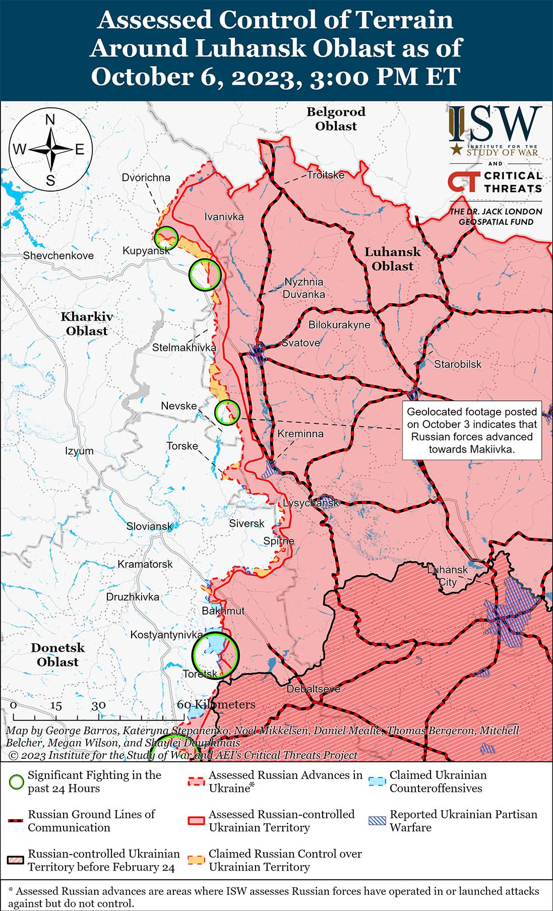 6 октября российские войска вели наступательные действия на линии Купянск — Сватово — Кременная и, как сообщается, продвинулись вперед. Спикер Восточной группировки войск Украины капитан Илья Евлаш заявил, что российские войска возобновили боевые действия на направлении Купянск-Лиман. [30] Российские военные блогеры утверждали, что российские войска возобновили наступательные действия в районе Синьковка (8 км к северо-востоку от Купянска), одновременно контратакуя на неустановленных участках Сватовского фронта. [31] Военблогеры утверждали, что российские войска интенсивно обстреливают трассу Н26 (Шевченково-Купянск). [32] Один из блогеров охарактеризовал наступление российских войск на Купянск как «широкомасштабное».[33] Другие блогеры утверждали, что российские войска добились неопределенного прогресса к северо-востоку от Купянска. [34] Российский новостной агрегатор сообщил, что 20 октября российские войска продвинулись в районе Кисловки (22 км к юго-востоку от Купянска) и успешно атаковали в районе Макеевки (5 км к северо-западу от Кременной). [35] 6 октября российский военный блогер заявил, что российские войска нанесли удары в районе Торского (15 км к западу от Кременной) и Макеевки, но не уточнил результат. [36] Генштаб ВСУ сообщал, что российские войска безуспешно атаковали вблизи Синьковки, Ивановки (20 км юго-восточнее Купянска) и Макеевки. [37]