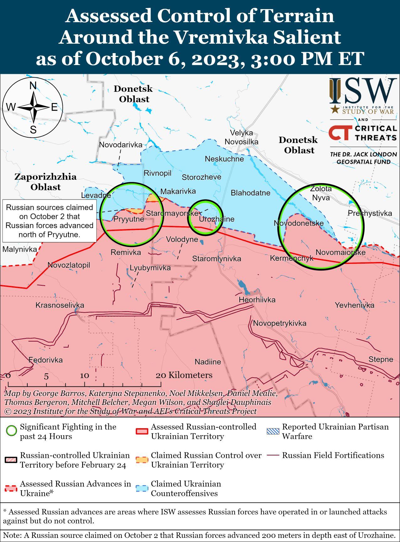 6 октября украинские силы продолжили контрнаступательные действия в районе Бахмута и продвинулись на западе Запорожской области. Украинские военные источники отметили, что украинские силы продолжили успешные наступательные действия к югу от Бахмута в районе Андреевка (8 км к юго-востоку от Бахмута). [1] На кадрах, опубликованных 5 октября, видно, что украинские войска продвинулись к границе леса между Роботино и Вербовое, примерно в 6 км к юго-востоку от Роботино. [2] Спикер Восточной группы войск Украины капитан Илья Евлаш отметил, что украинские силы готовятся к наступательным действиям в течение всего осенне-зимнего периода. Евлаш подчеркнул, что в то время как потребности в поставках будут расти, а дождливые и туманные условия могут осложнить использование беспилотников, тактической и армейской авиации, украинские силы продолжат сражаться всю зиму. [3] Заявление Евлаша подтверждает давнюю оценку ISW о том, что погода не помешает ни одной из сторон вести наступательные операции в течение зимы 2023-2024 годов, если они будут хорошо снабжены и решат это сделать, как это было зимой 2022 года, и что темпы украинских наступательных операций будут в значительной степени измеряться предоставлением Западом соответствующего стрелкового оружия и боеприпасов и нелетальных поставок Украине, а не только зимними погодными условиями или какой-либо конкретной системой вооружений. [4]