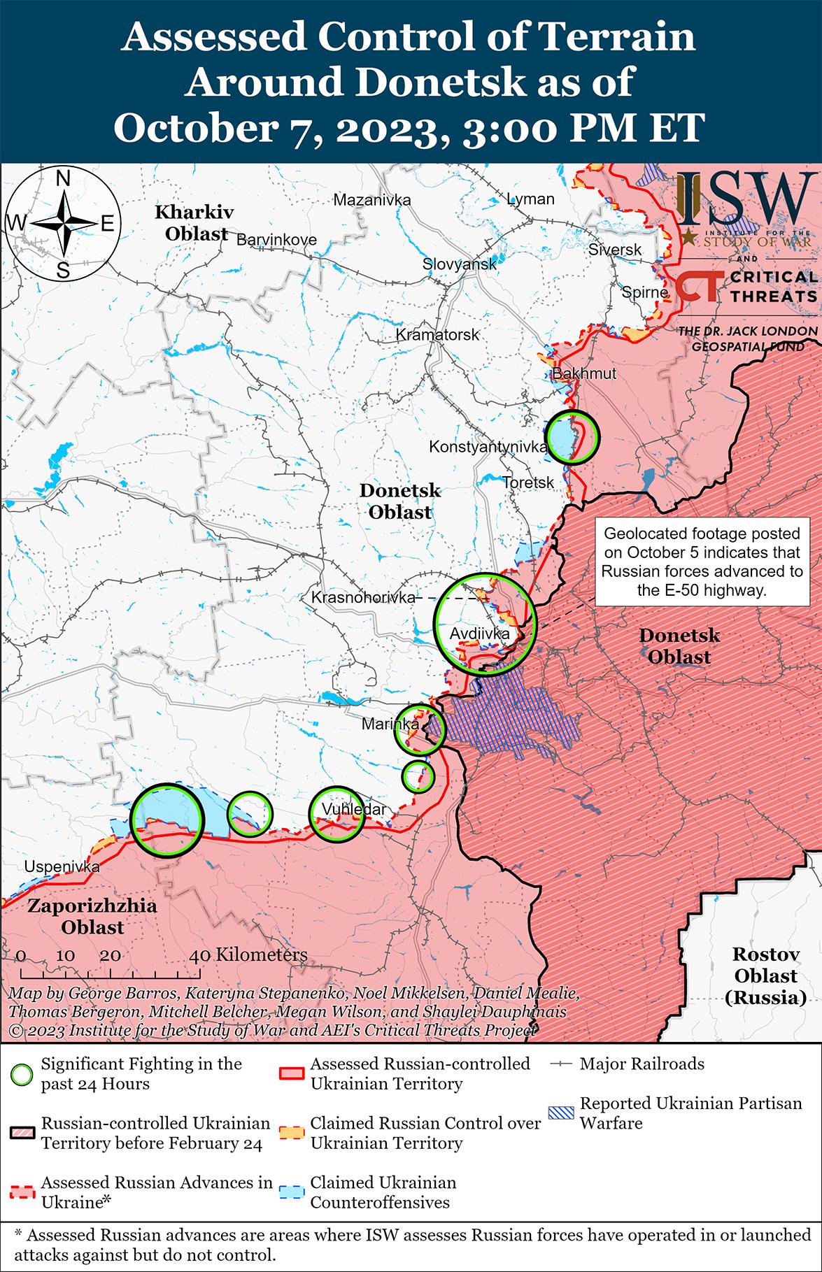 7 октября российские войска продолжили наступательные действия на линии Авдеевка – Донецк и, как сообщается, продвинулись в районе Марьинки (на юго-западной окраине Донецка). [40] Связанный с Кремлем военный блогер утверждал, что российские войска атаковали в районе Новомихайловки (10 км к юго-западу от Донецка) и Марьинки и после длительного периода позиционных боев немного продвинулись в районе Марьинки. [41] Блогер также утверждал, что российские войска безуспешно атаковали южные подступы к Авдеевке и провели разведку боем в районе населенного пункта Дружба (вероятно, имеется в виду населенный пункт в 10 км к северо-западу от Горловки, что к северо-востоку от района Донецка) с целью открытия нового района боевых действий. [42] Российский новостной агрегатор утверждал, что российские войска возобновили наступательные действия в районе Красногоровки (5 км к западу от Донецка) и что бои продолжаются на западной окраине Марьинки. [43] Генштаб Вооруженных сил Украины сообщил, что украинские силы отразили российские атаки вблизи Авдеевки, Первомайского (7 км к северо-западу от Донецка), Марьинки, Красногоровки и Новомихайловки. [44]