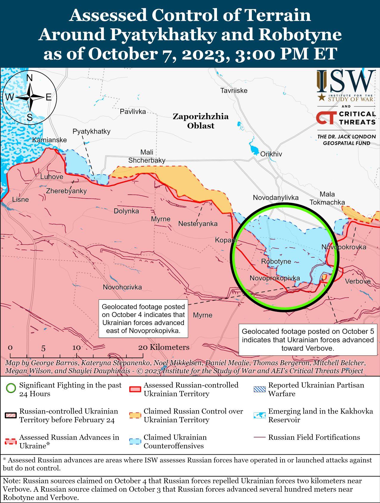 7 октября украинские силы продолжили наступательные действия на западе Запорожской области и, как сообщается, продвинулись вперед. Украинские военные источники сообщили, что украинские силы добились частичного успеха к северу от Копани (5 км к северо-западу от Роботино) и к северу от Новопрокоповка (2 км к югу от Роботино). [51] Российские военные блогеры утверждали, что бои на линии Роботино-Вербовое активизировались после того, как украинские войска возобновили наступление к северо-западу от Вербового. [52] Некоторые российские военные блогеры сообщали, что украинские военные также проводили ограниченные атаки к северу от Новопрокоповки, и в целом классифицировали ситуацию к югу от Орехова как сложную и напряженную. [53]