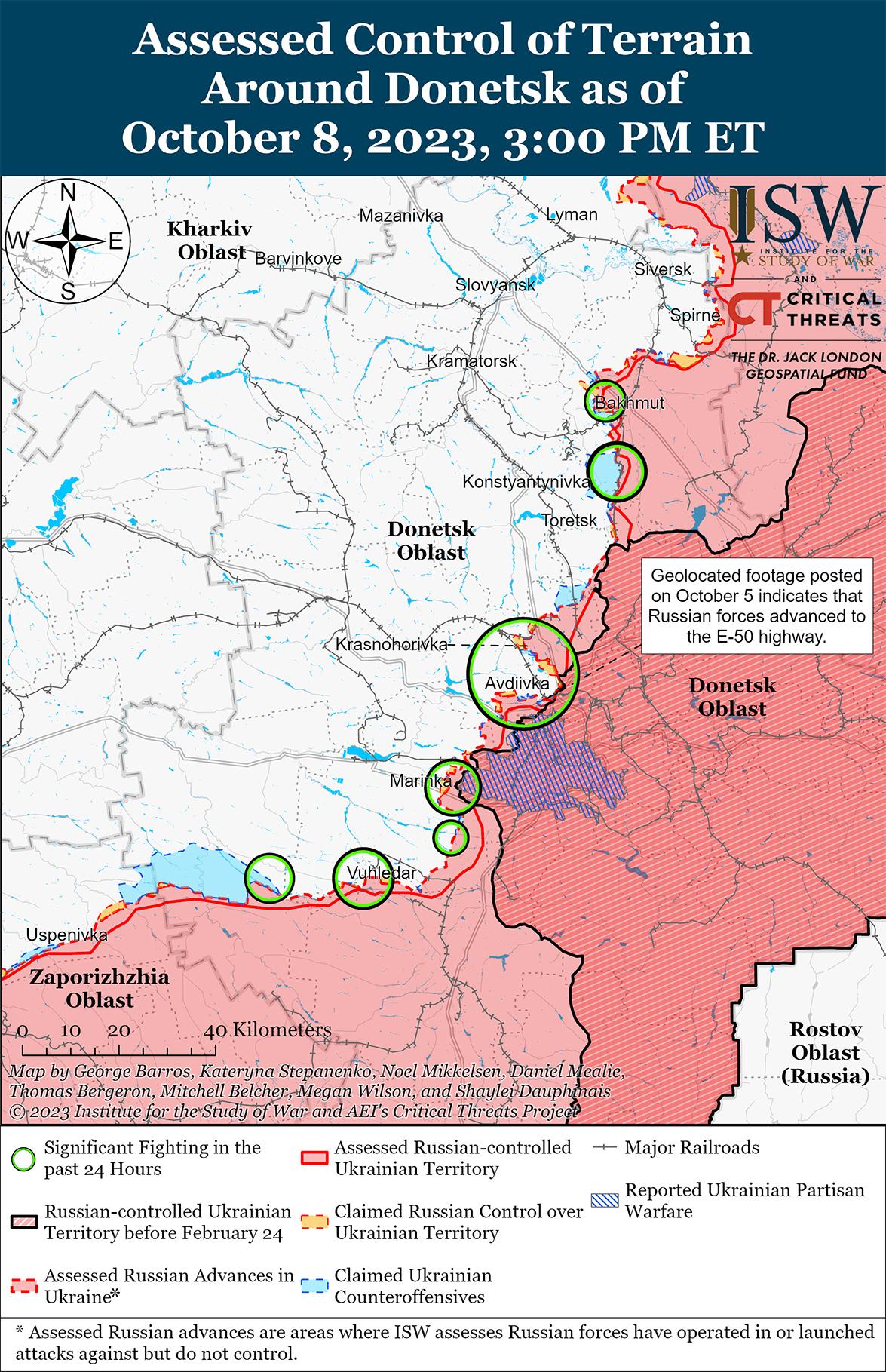 8 октября украинские силы продолжили наступательные действия в районе Бахмута и, как сообщается, продвинулись вперед. Украинский Генштаб и другие украинские военные источники сообщили, что украинские силы добились частичного успеха к северо-востоку от Андреевки (7 км к юго-западу от Бахмута). [37] Министерство обороны России заявило, что подразделения российской Южной группировки войск отразили украинские атаки в районе Андреевки. [38] Российский блогер утверждал, что украинские силы пытаются обойти Курдюмовку (11 км к юго-западу от Бахмута) с северо-востока и для этого наступают в направлении Зеленополья (12 км к юго-западу от Бахмута). [39] Блогер также отметил, что в последнее время украинские силы сместили свои усилия в сторону Курдюмовки, чтобы захватить оставшиеся тактические высоты к югу от Бахмута. [40] Другой блогер сообщил, что из-за ухудшения погодных условий и проливных дождей в этом районе стало меньше значительных передвижений украинцев, что затрудняет применение воздушной разведки. [41] См.