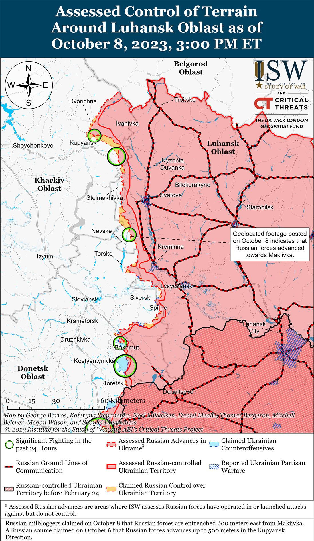 Российские войска 8 октября продолжили наступательные действия на линии Сватово — Кременная и в последнее время незначительно продвинулись. На геолоцированных кадрах, опубликованных 7 октября, видно, что российские войска продвинулись в направлении восточнее Макеевки Луганской области (22 км к северо-западу от Кременной) к позициям чуть менее чем в двух километрах от окраины населенного пункта.[32] Российские военблогеры высказали противоречивые утверждения о наступлении России под Макеевкой; один военблогер утверждал, что российские войска достигли окраины поселения, другой утверждал, что российские войска продвинулись на расстояние 600 метров от поселения, а третий утверждал, что российские войска остаются чуть более чем в одном километре от поселения, что не согласуется с самым дальним наблюдаемым российским продвижением в этом районе, примерно в двух километрах от населенного пункта. [33] Другой военблогер заявил, что российские войска предприняли неуказанные наступления в районе Макеевки и что в конечном итоге российские войска стремятся оттеснить украинские войска к западному берегу реки Оскол, но российские войска, вероятно, слишком ослаблены, чтобы достичь этой цели в ближайшей перспективе. [34]
