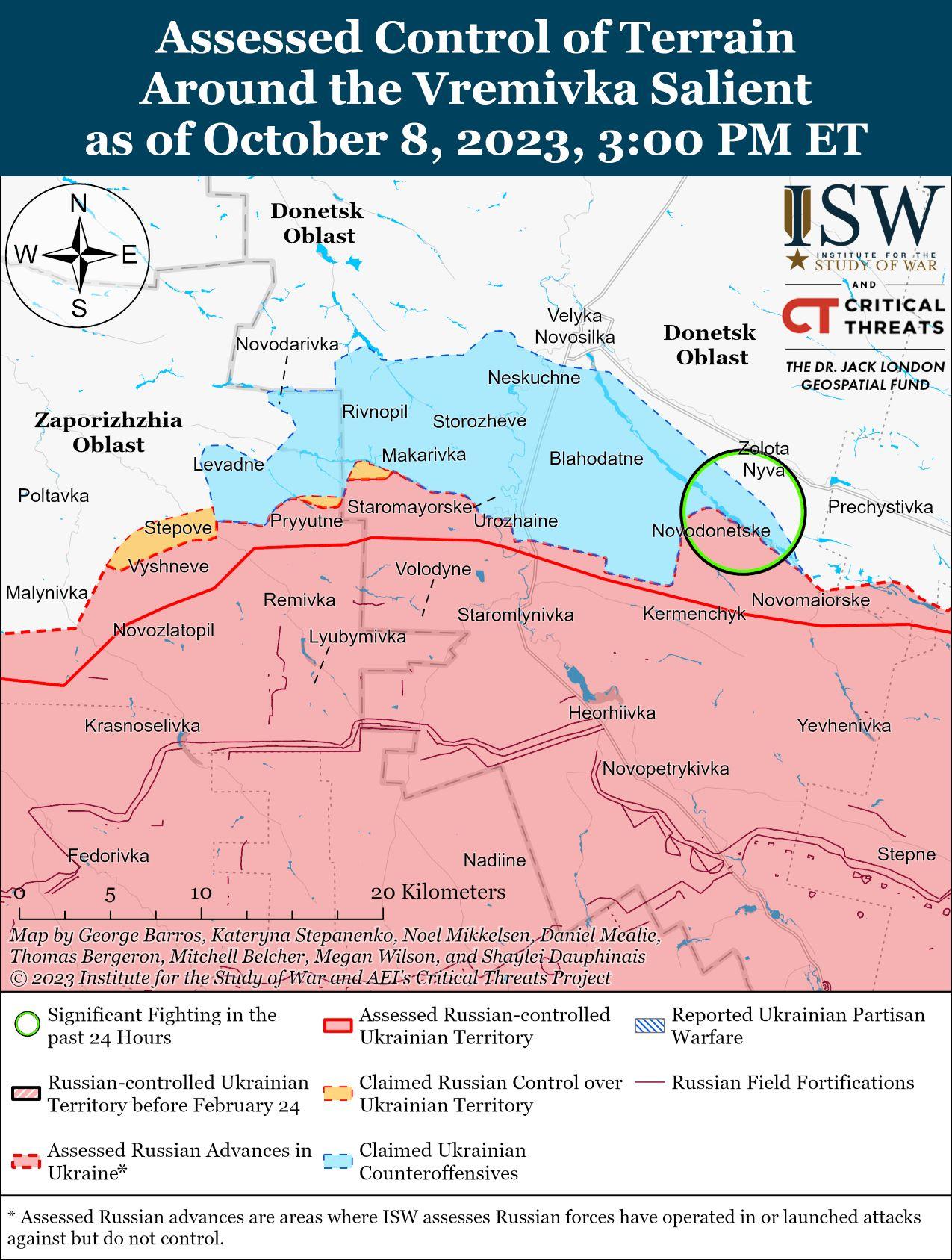 8 октября украинские силы продолжили наступление на западе Донецкой области и в районе границы Донецкой-Запорожской областей, но не добились каких-либо подтвержденных успехов. Министерство обороны (МО) России заявило, что подразделения российской Восточной группировки войск отразили украинские атаки северо-восточнее Никольского (4 км к юго-западу от Угледара и 33 км к юго-востоку от Великой Новоселки), к западу от Новодонецкого (11 км к юго-востоку от Великой Новоселки), к западу от Старомайорского (8 км к юго-западу от Великой Новоселки) и к северу от Приютного (15 км к юго-западу от Великой Новоселки). [48] Российский военный блогер утверждал, что украинские войска безуспешно атаковали в неустановленной лесополосе, вероятно, к западу от Старомайорского, ежедневно пытаются улучшить позиции к северу от Приютного и пытаются вернуть утраченные позиции к западу от Новодонецкого. [49] По оценкам Минобороны Великобритании, последние четыре недели на участке фронта в районе Великая Новоселка было относительно спокойно, и украинские силы освободили не менее 125 квадратных километров на этом участке фронта. [50] По оценкам ISW, с начала контрнаступления в июне 2023 г. украинские силы освободили почти 215 кв. км на границе Донецкой-Запорожской областей. Министерство обороны Великобритании также отметило, что украинские операции в районе Великой Новоселки успешно закрепили в этом районе части 5-й и 36-й общевойсковых армий (ОА) Восточного военного округа (ВВО) и некоторые неуказанные воздушно-десантные подразделения. [51] См.