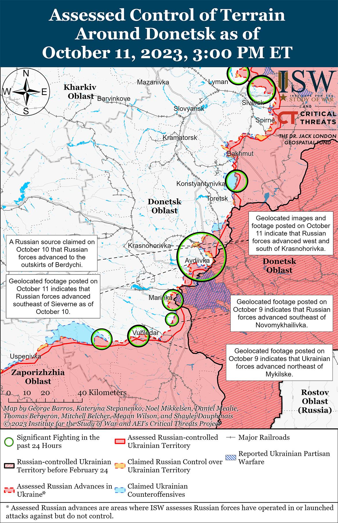 11 октября российские войска подтвердили продвижение вблизи Авдеевки. Геолоцированные кадры, опубликованные 11 октября, свидетельствуют о том, что российские войска продвинулись к югу и западу от Красногоровки (8 км к северо-западу от Авдеевки). [42] Дополнительные геолоцированные кадры свидетельствуют о том, что российские войска продвинулись к юго-востоку от Северное (6 км к западу от Авдеевки). [43] Украинский источник сообщил, что российские войска атаковали из Новоселовка Вторая (9 км к северо-востоку от Авдеевки), Веселое (6 км к северу от Авдеевка), Водяное (северо-западная окраина Донецка), Пески (8 км к юго-западу от Авдеевка) и Красногоровка (непосредственно к западу от Донецка) и захватили несколько неустановленных позиций, понеся при этом тяжелые потери. [44] Российские источники, в том числе Министерство обороны России, утверждали 10 и 11 октября, что российские войска продвинулись в районе Бердичи (10 км к северо-западу от Авдеевка), Северное, Водяное и Степное (14 км к югу от Донецка) и ведут наступление в районе Спартак (4 км южнее Авдеевка). [45] Связанный с Кремлем военный блогер утверждал, что российские войска прорвали украинскую оборону к юго-западу от Красногоровки. [46] По его словам, российские войска еще не вышли на окраины Северного и Тоненького (7 км к северо-западу от Авдеевки). [47] Пресс-секретарь украинской Таврической группировки войск полковник Александр Штупун заявил, что украинские силы отразили атаки противника в районах населенных пунктов Очертино (15 км к северо-западу от Авдеевки), Керамик (14 км к северо-западу от Авдеевки), Бердичи, Степное (8 км к северо-западу от Авдеевки), Тоненькое (7 км к северо-западу от Авдеевки), Авдеевка, Ласточкино (6 км к западу от Авдеевки) и Первомайское (11 км к юго-западу от Авдеевки). [48] Российский источник утверждал, что российские войска в основном атаковали севернее Авдеевки в районе Красногоровки и к югу от Авдеевки от Опытного (3 км к юго-западу от Авдеевки) в направлении Северного. [49] Другие российские блогеры утверждали, что российские войска контролируют огнем дорогу, ведущую в Авдеевку, что отрезает путь снабжения украинских войск в населенном пункте. [50]