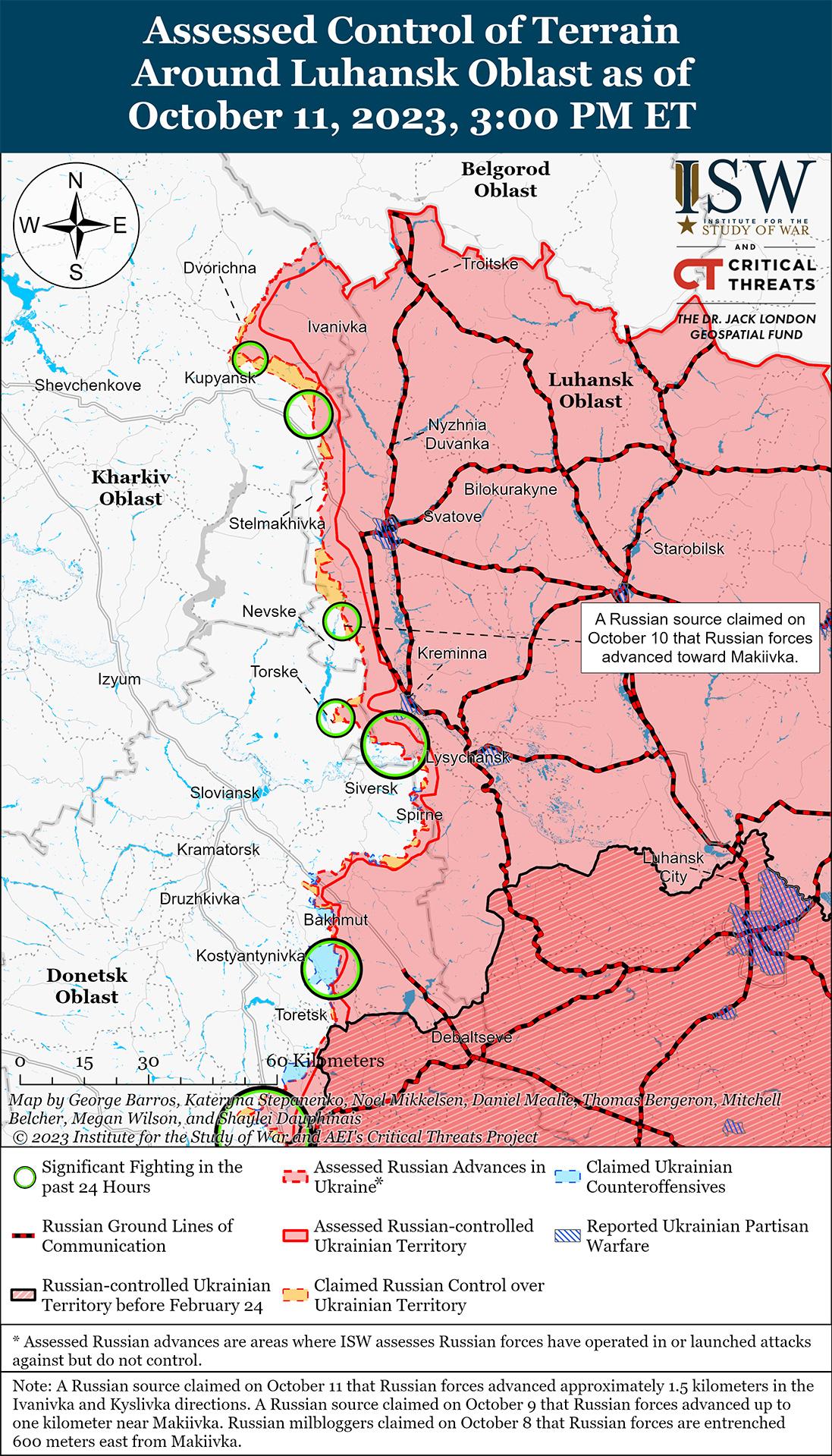 11 октября российские войска вели наступательные действия вдоль линии Сватово-Кременная и, как сообщается, продвинулись вперед. Российские источники утверждали, что российские войска, в том числе части недавно сформированной 25-й российской ОА, продвинулись в районе Макеевки (22 км к северо-западу от Кременной) и Невского (18 км к северо-западу от Кременной). [34] Генштаб Вооруженных сил Украины сообщил, что украинские войска продолжают сдерживать российские войска в районе Макеевки и Дибровой (7 км к юго-западу от Кременной). [35]