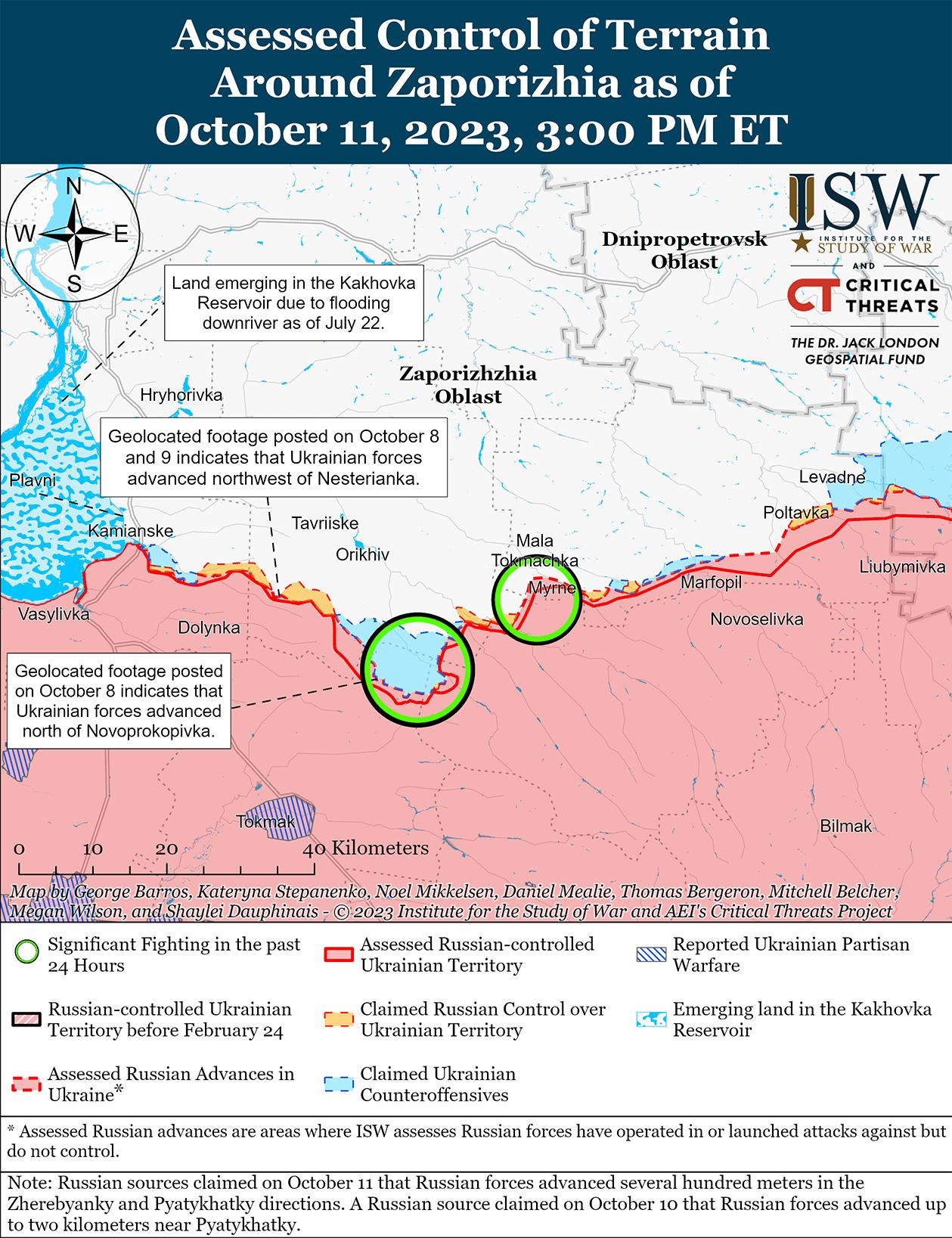 - Украинские силы продолжили контрнаступательные действия в районе Бахмута и на западе Запорожской области и, по сообщениям, 11 октября продвинулись на обоих участках фронта.