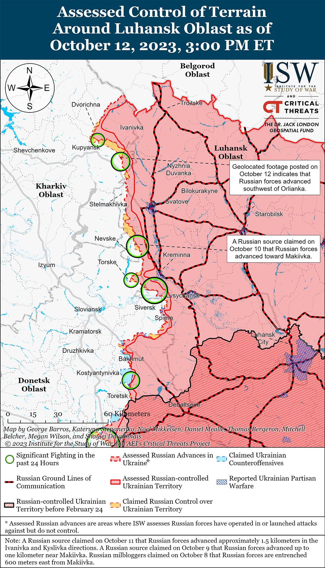 По состоянию на 12 октября российские войска не добились крупных прорывов в районе Авдеевки и вряд ли смогут сразу отрезать украинские силы в городе. По оценкам ISW, с 4 октября российские войска захватили 52,10 квадратных километра территории с разных направлений вокруг Авдеевки, и что российские войска находятся в 3,32 км от украинской наземной линии коммуникаций (НЛК) вдоль трассы O0562 с юга и в 5,25 км с севера от Авдеевки, и заявления России о продвижении за пределы этих расстояний, вероятно, преувеличены. Российские источники утверждали, что российские войска пытаются создать котел вокруг украинских войск в Авдеевке, но быстро признали, что нынешнее продвижение идет медленно. [5] Глава Донецкой Народной Республики (ДНР) Денис Пушилин заявил, что пока рано говорить о «полномасштабном исходе [украинцев] из города», несмотря на некоторые успехи России в этом районе. [6] Российский блогер утверждает, что российские войска уже продвинулись на 12 км в направлении Авдеевки, несмотря на то, что геолокационные кадры свидетельствуют лишь о том, что по состоянию на 12 октября российские войска продвинулись ограниченно к северо-западу, югу и западу от Авдеевки и не угрожали украинским силам окружением. [7] Российские военные блогеры утверждали, что российские войска закрепились на участке на северном фланге Авдеевки в районе Авдеевского коксохимического завода; захватили участок железной дороги к югу от Авдеевки; и продвинулись по городу, но ISW не может подтвердить эти утверждения на это время. [8] Российские источники также утверждали, что российские войска разрушили железнодорожную станцию Очеретино (13 км к северо-западу от Авдеевки), которая, по их словам, поддерживает украинскую логистику в Авдеевку. [9]