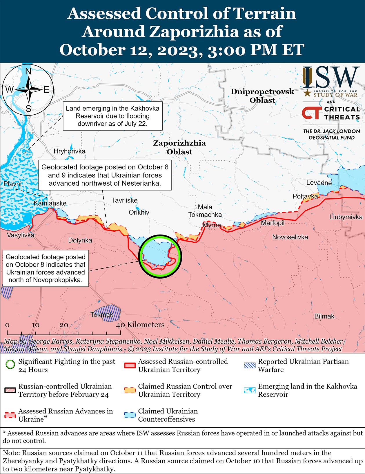 Сообщается, что 12 октября украинские войска незначительно продвинулись на западе Запорожской области. Украинский Генштаб и Штупун сообщили, что украинские силы улучшили свои тактические позиции к западу от Роботино. [72] Российский блогер утверждал, что украинские войска атаковали вблизи Новопрокоповки (13 км к югу от Орехова) и Новокарловки (18 км к юго-востоку от Орехова). [73] Российские военные блогеры утверждали, что российские войска отразили украинские атаки на участке Роботино – Копани (5 км к северо-западу от Роботино) и в районе Вербовое (18 км к юго-востоку от Орехова). [74] Российские военные блогеры утверждали, что украинские войска снизили темп наступательных действий на западе Запорожской области. [75]