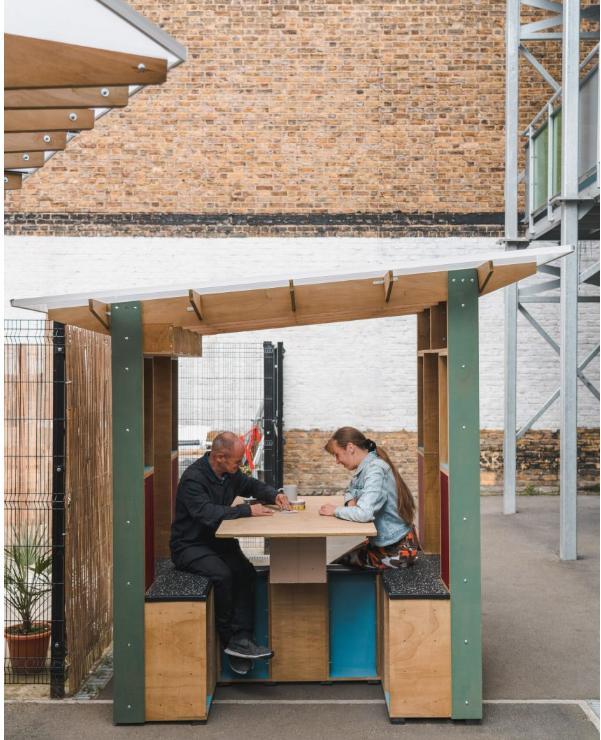 Архитектурный дизайнер Джордж Фишер создал открытое социальное пространство для Project Malachi, общежития для бездомных в Лондоне, используя модульную систему U-Build, разработанную Studio Bark .