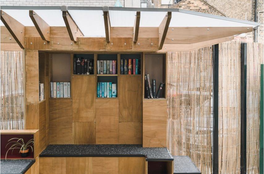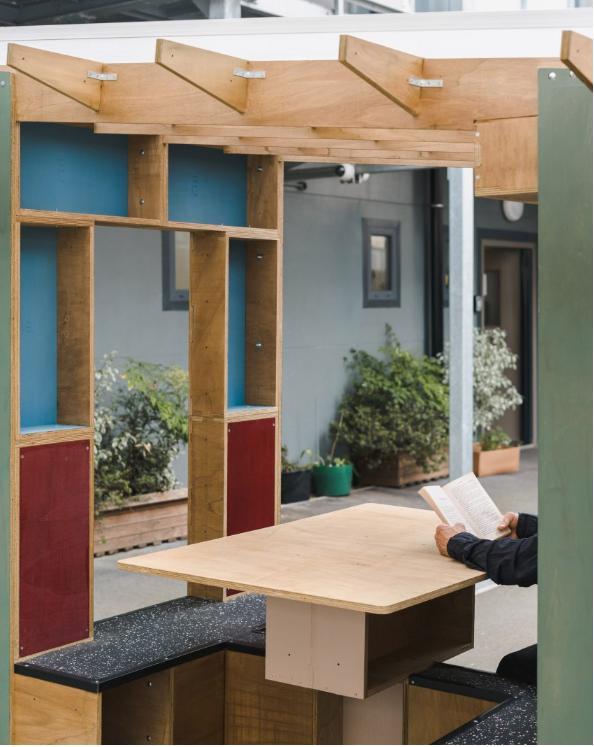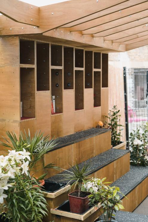 Окончательный проект включает в себя стол, за которым жители могут сидеть, а также красочные ниши, где жильцы могут хранить книги для общего пользования. Полупрозрачные пластиковые крыши защищают жильцов от дождя.