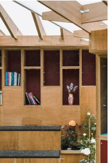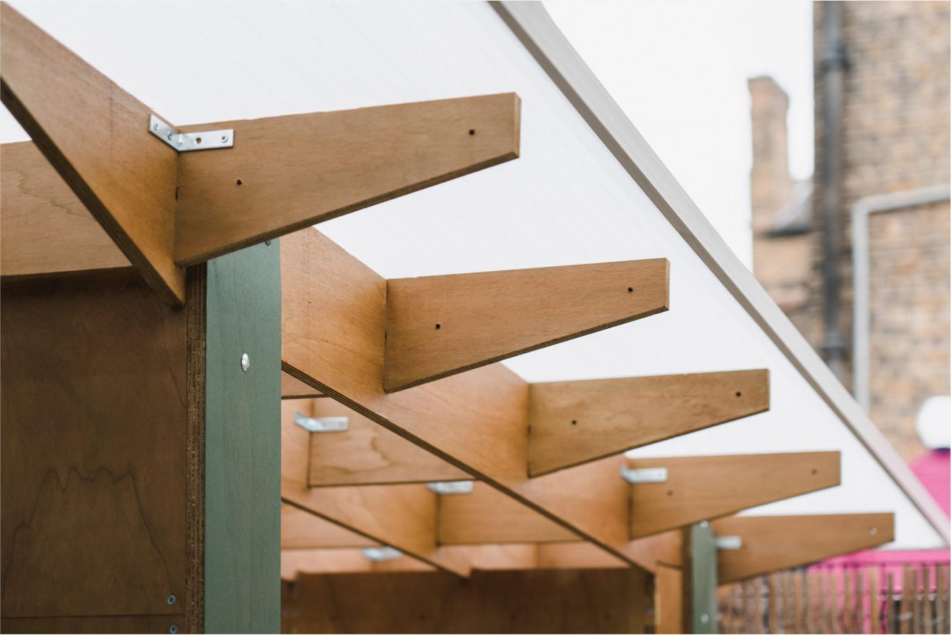 Открытую площадку составляют три разные фанерные конструкции, каждая из которых построена с использованием U-Build — простой системы плоского строительства , разработанной архитектурной фирмой Studio Bark для поощрения проектов самостоятельного строительства.