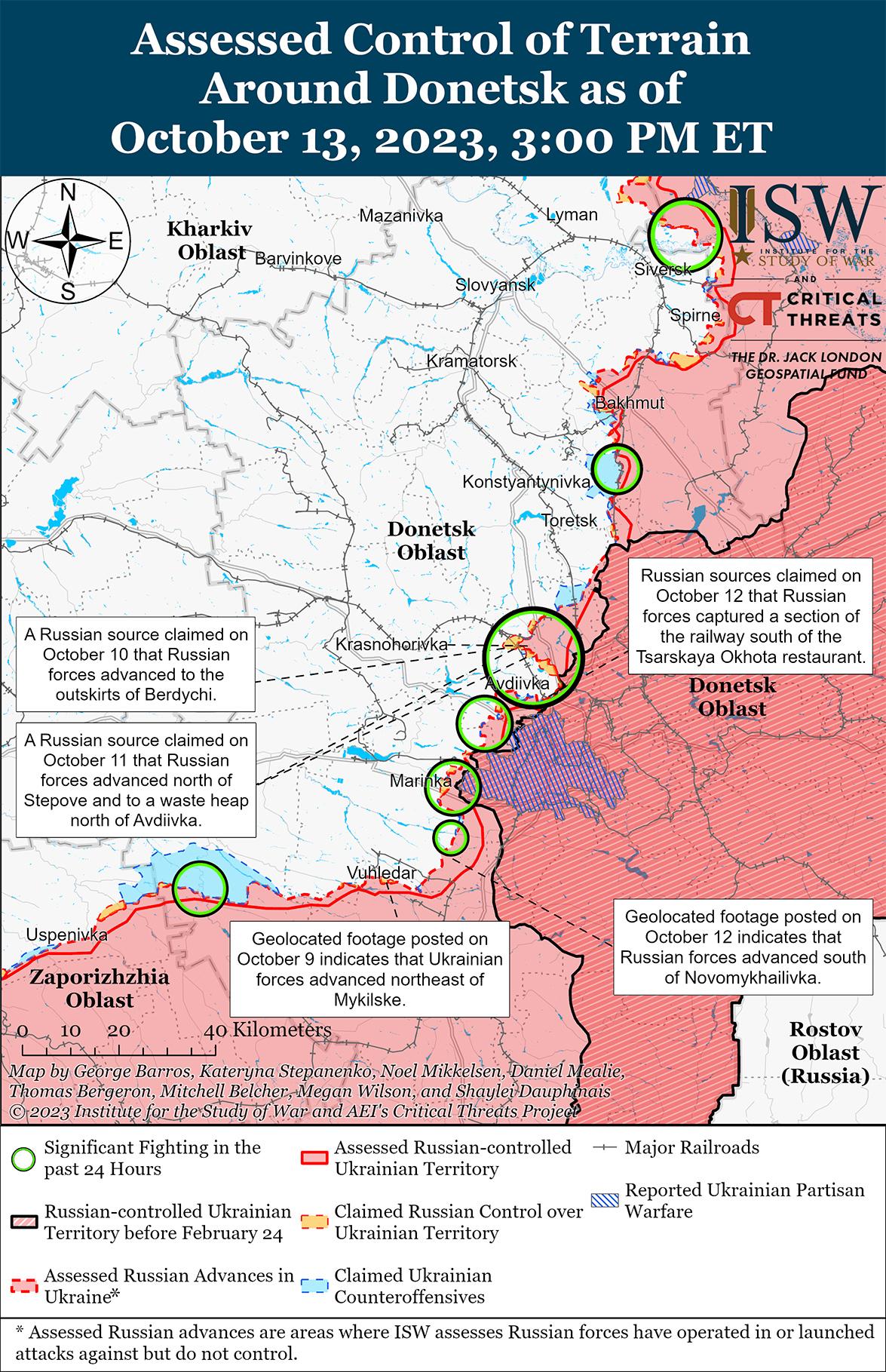 Сообщается, что продолжающиеся 13 октября российские наступательные операции в районе Авдеевки Донецкой области столкнулись с неудачами в окрестностях города. Российские источники утверждали, что российские войска продолжали атаковать районы к северу и югу от Авдеевки, а геолоцированные кадры, опубликованные 12 и 13 октября, свидетельствуют о том, что российские войска продвинулись к югу от Красногоровки (5 км к северу от Авдеевки) и к юго-востоку от Первомайского (11 км к юго-западу от Авдеевки). [1] Российские источники также опубликовали противоречивые сообщения о предыдущих заявлениях российских источников о том, что Россия контролирует Авдеевский коксохимический завод, а ISW не обнаружил никаких доказательств, подтверждающих, что российские войска контролируют завод на момент публикации. [2] Украинские военные сообщили, что украинские силы продолжают отражать российские атаки в районе Авдеевки. [3] Российский блогер отметил, что украинские силы используют минные поля, чтобы замедлить продвижение российских войск на Авдеевском направлении. [4] Российский доброволец из 4-й бригады Луганской Народной Республики (ЛНР) (2-й армейский корпус, Южный военный округ) заявил, что изношенные стволы снижают точность российской артиллерии в районе Авдеевки. [5] Волонтер оценил, что российские войска могут «сжать [украинский] периметр», захватив менее укрепленную украинскую территорию в районе Авдеевки, но выразил обеспокоенность тем, что российские генералы неправильно истолкуют эти ограниченные успехи и попытаются ускорить наступление на Авдеевку. Волонтер отметил, что такое неверное толкование может привести к тому, что российские войска будут «бить по бетонным» укреплениям, пока эти силы не закончатся.