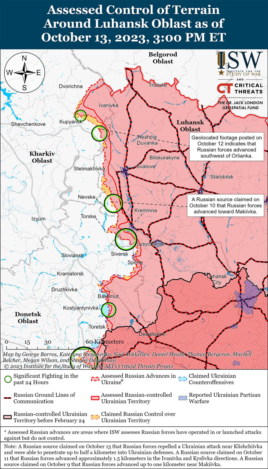 13 октября враг продолжил наступательные действия на участке Сватово-Кременная, но подтвержденных территориальных завоеваний не добился. Российский военный блогер заявил, что российские войска захватили несколько украинских позиций к западу от Сватово, но не предоставил дополнительной информации о заявленном продвижении. [25] Генштаб Вооруженных сил Украины сообщил, что украинские силы отбили российские атаки вблизи Макеевки (20 км к юго-западу от Сватово) к юго-западу от Кременной и в Серебрянском лесничестве к югу от Кременной. [26] Связанный с Кремлем блогер утверждал, что российские войска атаковали в направлении Серебрянки (12 км к юго-западу от Кременной) со стороны Кузьмино (3 км к юго-западу от Кременной) с целью прорвать украинскую оборону и выйти к реке Северский Донец. [27] Блогер добавил, что российские войска атаковали в районе Торское (14 км к западу от Кременной) с целью отрезать украинский маршрут снабжения через реку Оскол. Глава Чеченской Республики Рамзан Кадыров указал, что чеченская группа “Амур” спецназа “Ахмат” действует в Серебрянском лесничестве. [28] См.