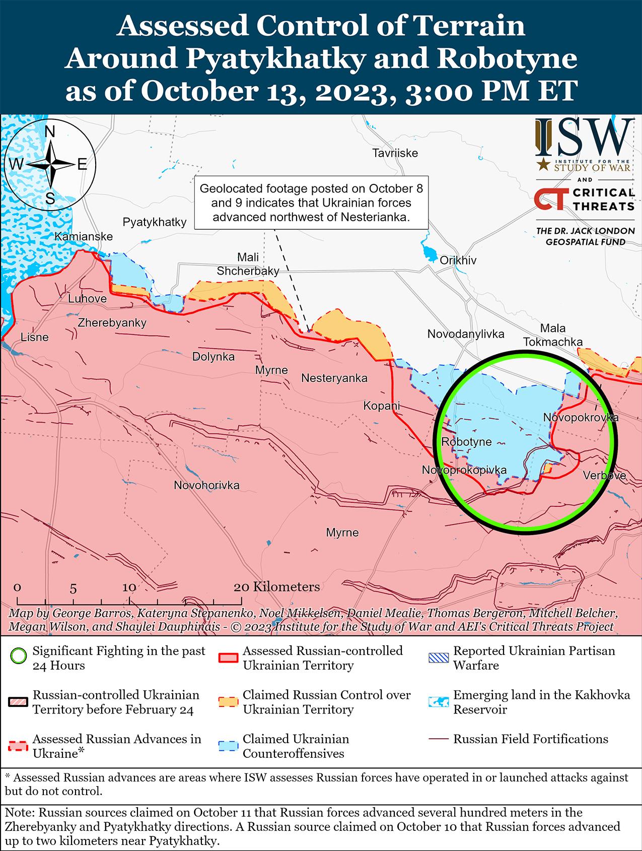 13 октября российские войска вели штурмовые действия на западе Запорожской области и продвигались незначительно. На геолоцированных кадрах, опубликованных 13 октября, видно, что российские войска незначительно продвинулись к северу от Копани (11 км к юго-западу от Орехова и 5 км к северо-западу от Роботино). [56] Украинский Генштаб сообщил, что российские войска вели безуспешные атаки в районе Роботино. [57] 12 октября российский военный блогер заявил, что российские войска недавно улучшили свои позиции в районе Пятихаток (25 км к юго-западу от Орехова и 29 км к северо-западу от Роботино). [58] 13 октября российский военный блогер опубликовал кадры, на которых, как утверждается, запечатлены части российского 108-го десантно-штурмового полка (7-й дивизии ВДВ), действовавшие в районе Вербового. [59] См.