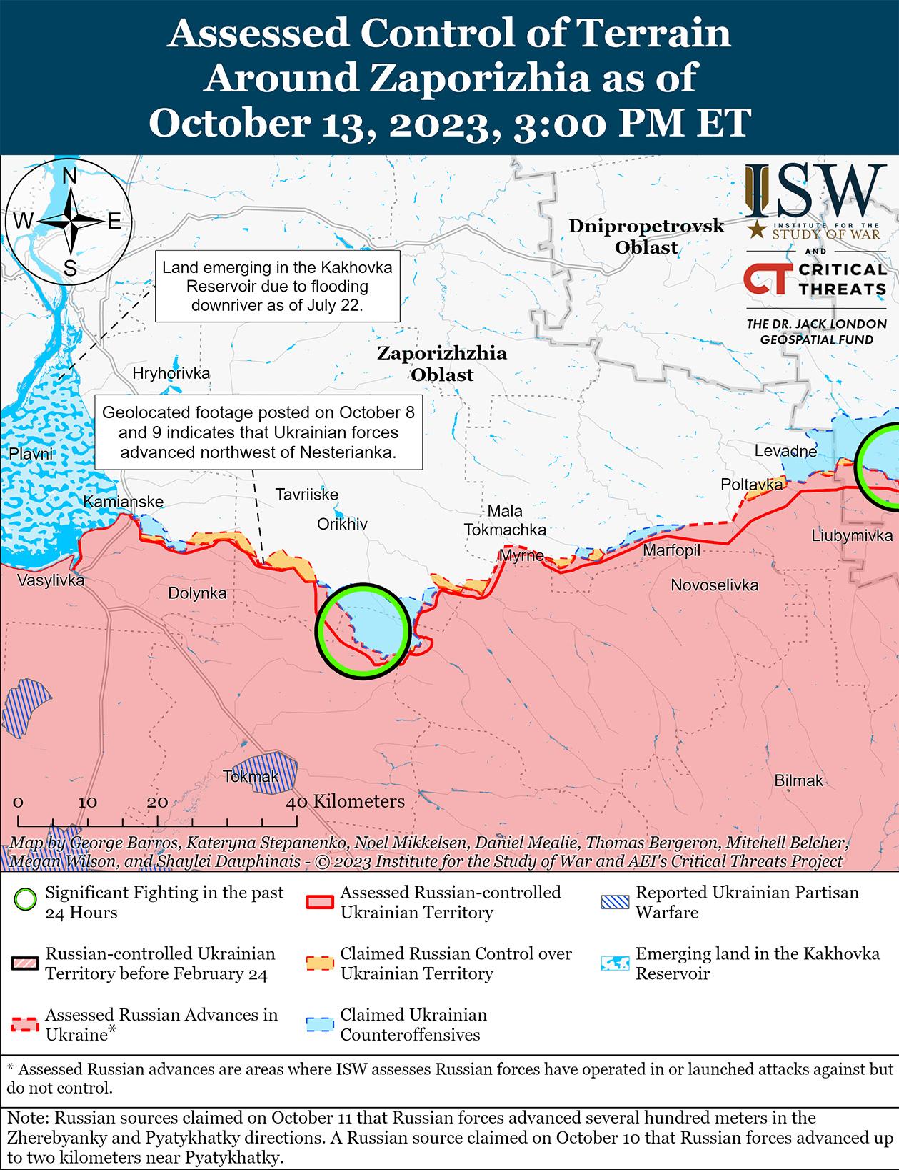 Сообщается, что 13 октября украинские силы провели безуспешные атаки на западе Запорожской области. Российские блогеры утверждают, что 12 и 13 октября украинские силы продолжали безуспешные атаки на линии Роботино-Вербовое (от 10 км к югу до 18 км к юго-востоку от Орехова).[53] Российский агрегатор новостей заявил, что) 12 октября украинские силы также безуспешно атаковали российские позиции в Новопрокоповке (13 км к югу от Орехова и в 2 км к югу от Роботино.[54] В Минобороны России заявили, что на прошлой неделе украинские силы провели безуспешные атаки в районе Вербовое и Роботино.[55]