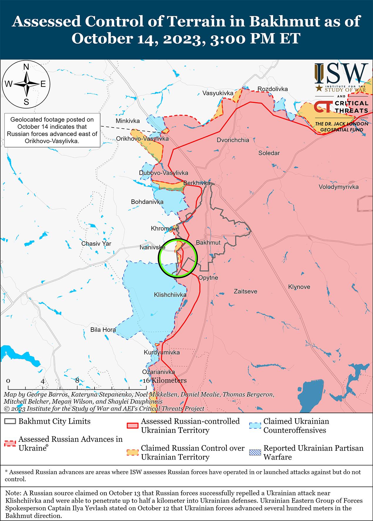 14 октября российские войска продолжили штурмовые действия в районе Бахмута и продвинулись вперед. Геолоцированные кадры, опубликованные 14 октября, свидетельствуют о том, что российские войска продвинулись к востоку от Орехово-Васильевки (10 км к северо-западу от Бахмута). [39] Известный российский блогер утверждал, что российские войска заняли позиции к востоку от неустановленной трассы, возможно, трассы Т0513, недалеко от Клещеевки и Андреевки. [40] Командующий Сухопутными войсками Украины генерал-полковник Александр Сырский заявил, что российские войска регулярно ведут ночные атаки на Бахмутском направлении. [41]
