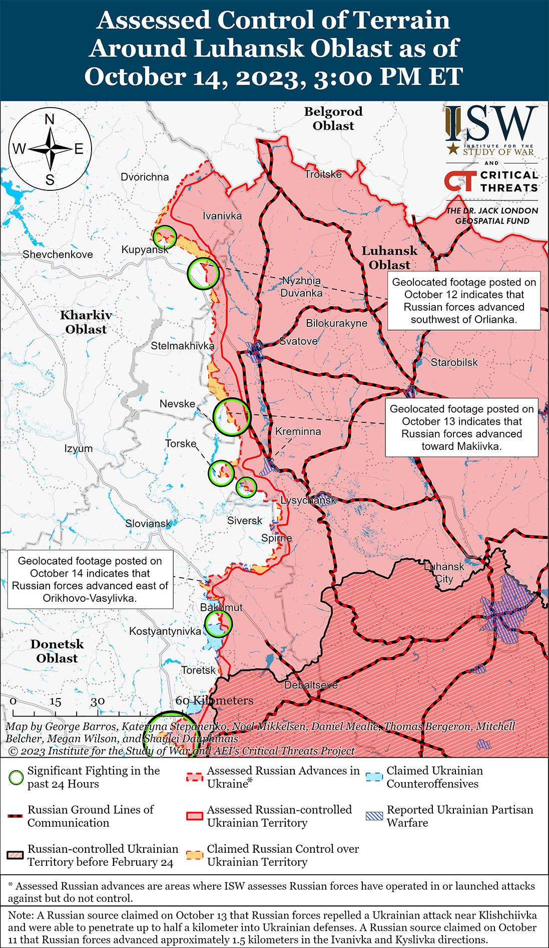 Русские войска 14 октября продолжили наступательные действия на рубеже Купянск, Сватово, Кременная и незначительно продвинулись юго-западнее Сватово. На геолоцированных кадрах, опубликованных 13 октября, видно, что российские войска незначительно продвинулись вдоль дороги к востоку от Макеевки Луганской области.[27] Некоторые российские блогеры утверждают, что за последние несколько дней российские войска продвинулись более чем на один километр вглубь территории, контролируемой Украиной, и захватили 10 украинских позиций на линии Лиман Перший — Орлянка (12 км к северо-востоку и 20 км к востоку от Купянска).[28] Генштаб Украины сообщил, что украинские войска отразили атаки российских войск в районе Синьковки (8 км к северо-востоку от Купянска), Ивановки (19 км к юго-востоку от Купянска) и Кисловки (21 км к юго-востоку от Купянска) в Харьковской области, а также в районе Макеевки и Торского (14 км к западу от Кременной) в Луганской области.[29] Украинский военный обозреватель Константин Машовец сообщил, что подразделения 252-го мотострелкового полка и 237-го танкового полка (оба входят в состав 3-й мотострелковой дивизии 20-й общевойсковой армии [ОА] Западного военного округа [ЗВО]) пытаются прорвать украинские позиции на Линии Невское-Нововодяное (18 км к северо-западу – 16 км к юго-западу от Сватово) и Площанка-Макеевка (16 км к северо-западу – 20 км к юго-западу от Кременной)[30]. Машовец также сообщил, что в Серебрянском лесничестве (11 км к югу от Кременной) действуют российская 164-я мотострелковая бригада (25-я ОА Восточного военного округа (ВВО)) и 331-й воздушно-десантный полк (98-й воздушно-десантной дивизии).