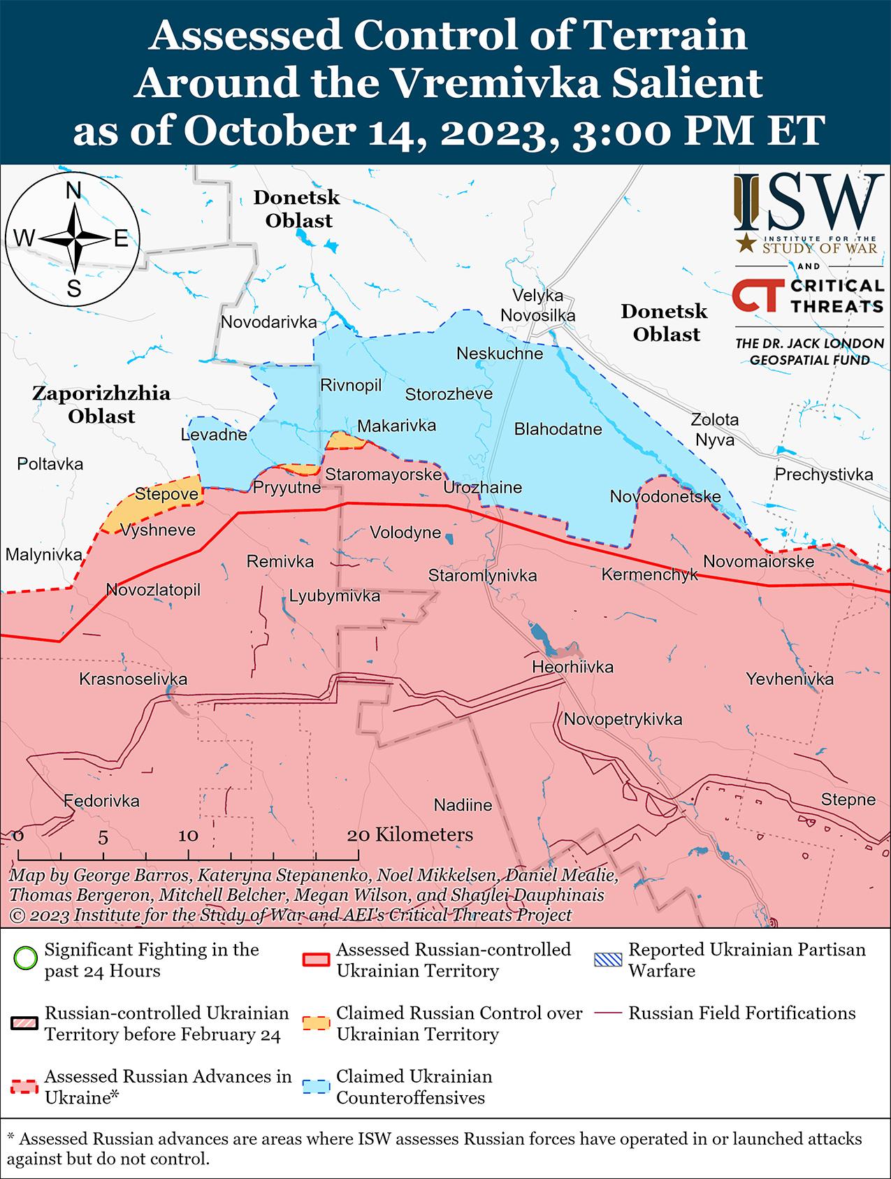 Российские источники утверждали, что украинские силы вели наступательные действия на границе Донецкой-Запорожской областей, но 14 октября не продвинулись вперед. Российский военный блогер заявил, что украинские войска безуспешно атаковали к западу от Старомайорского (9 км к югу от Великой Новоселки) и к востоку от Урожайного (9 км к югу от Большой Новоселки). [54] Российский блогер также утверждал, что позиционные бои продолжаются вдоль оврага Грушевого к северу от Приютного (16 км к юго-западу от Великой Новоселки). [55]