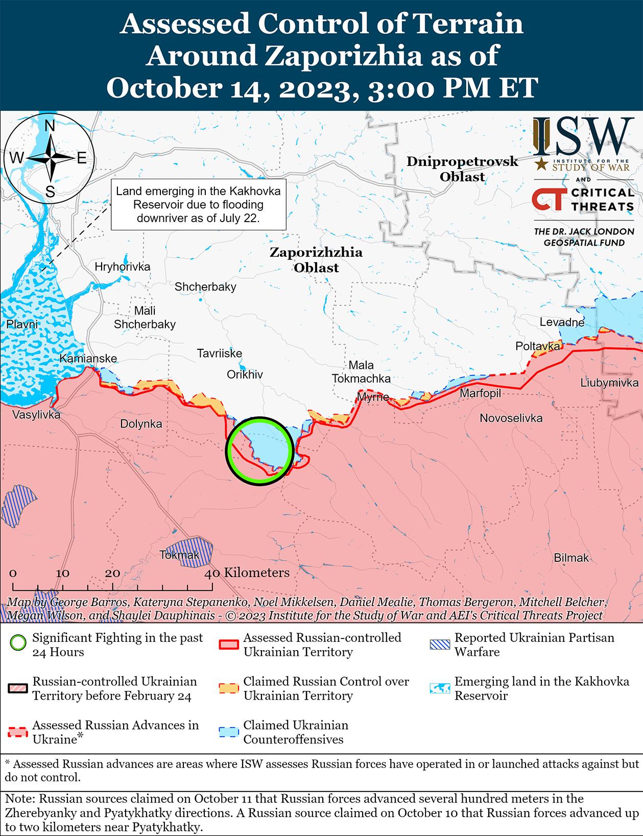 Украинские силы вели наступательные действия на западе Запорожской области и, как сообщается, 14 октября добились ограниченных успехов. Российский блогер заявил, что украинские войска незначительно продвинулись к западу от Роботино (10 км к югу от Орехова) в направлении Ровно (24 км к юго-западу от Орехова). [59] Российские источники, в том числе Министерство обороны России, утверждали, что украинские силы безуспешно атаковали вблизи Вербовое (18 км к юго-востоку от Орехова), Роботино и Новопрокоповка (13 км южнее Орехов). [60] Российские источники утверждали, что бои продолжаются на западной окраине Вербового. [61]