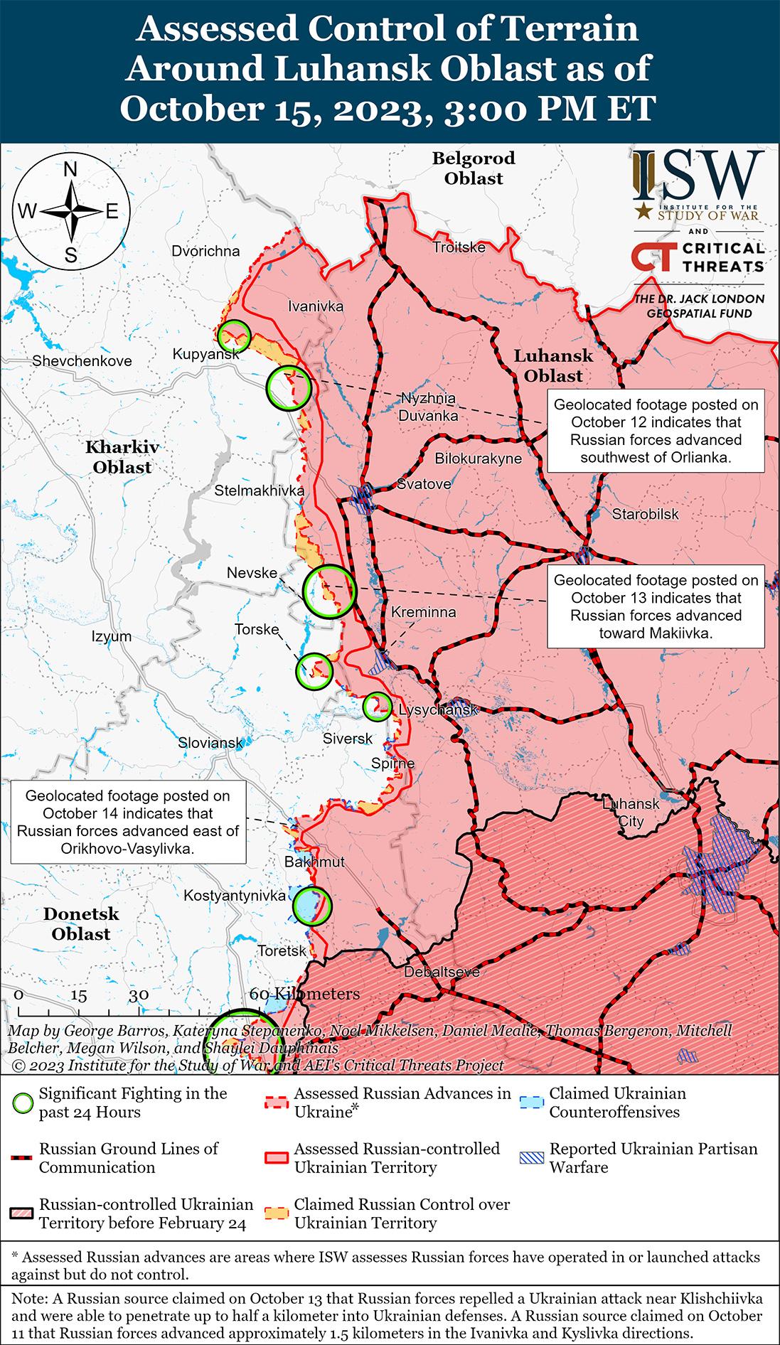15 октября российские войска продолжили наступательные действия в районе Авдеевки, но подтвержденных успехов не добились. Украинский Генштаб сообщил, что украинские силы отбили более 15 российских атак вблизи Авдеевки; севернее Авдеевки в районе Степового и Керамика (до 13 км северо-западнее Авдеевки); юго-западнее Авдеевки в районе Тоненького, Северного и Первомайского (до 11 км юго-западнее Авдеевки). [40] 14 и 15 октября российские военные блогеры утверждали, что российские войска продвинулись в районе Новокалиново (13 км к северу от Авдеевки) и что украинские войска отступили из неустановленных опорных пунктов в районе Авдеевки. [41] Один из российских блогеров заявил, что российские войска сосредотачиваются на захвате позиций в районе Авдеевки, которые наименее уязвимы для огня украинской артиллерии, чтобы создать условия для дальнейших наступательных операций. [42] Российские источники утверждали, что российские войска теперь могут перекрыть все украинские наземные линии коммуникаций (НЛК) в Авдеевке, хотя известный российский блогер заявил, что эти утверждения преждевременны. [43] Ранее в июле и августе 2023 г. российские военные блогеры утверждали, что подразделения интернациональной бригады «Пятнашка» Донецкой Народной Республики (ДНР) установили огневой контроль над украинскими НЛК в районе Авдеевки. [44] Однако ISW не обнаружил никаких признаков того, что эти настойчивые заявления России о российском огневом контроле над украинскими НЛК в районе Авдеевки соответствуют действительности.