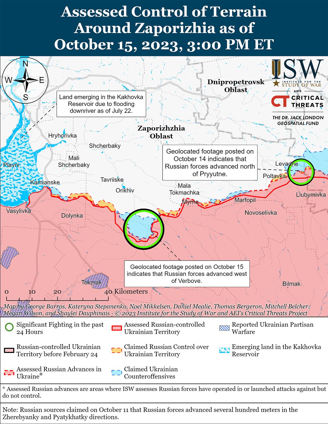 15 октября украинские силы продолжили наступательные действия под Бахмутом и на западе Запорожской области и немного продвинулись южнее Бахмута. Геолоцированные кадры, опубликованные 15 октября, показывают, что украинские силы незначительно продвинулись к железнодорожной линии к северу от Клещеевки (7 км к юго-западу от Бахмута), а российские источники сообщили о продолжающихся украинских наземных атаках к югу от Бахмута на линии Клещеевка-Курдюмовка-Андреевка (7-13 км к юго-западу от Бахмута). [21] Украинский военный обозреватель Константин Машовец заявил, что украинские силы воспользовались недавними российскими контратаками на западе Запорожской области для постепенного продвижения в районе Копани (5 км к северо-западу от Роботино), к востоку от Нестерянки (10 км к северо-западу от Роботино) и в районе Вербового (18 км к юго-востоку от Орехова). [22] Однако украинские официальные лица пока не комментируют какие-либо недавние успехи Украины на линии Роботино-Новопрокоповка-Вербовое (20 км к юго-западу от Орехова). Российские источники сообщали о продолжении украинских атак на линии Роботино-Новопрокоповка-Вербовое 15 октября. [23]